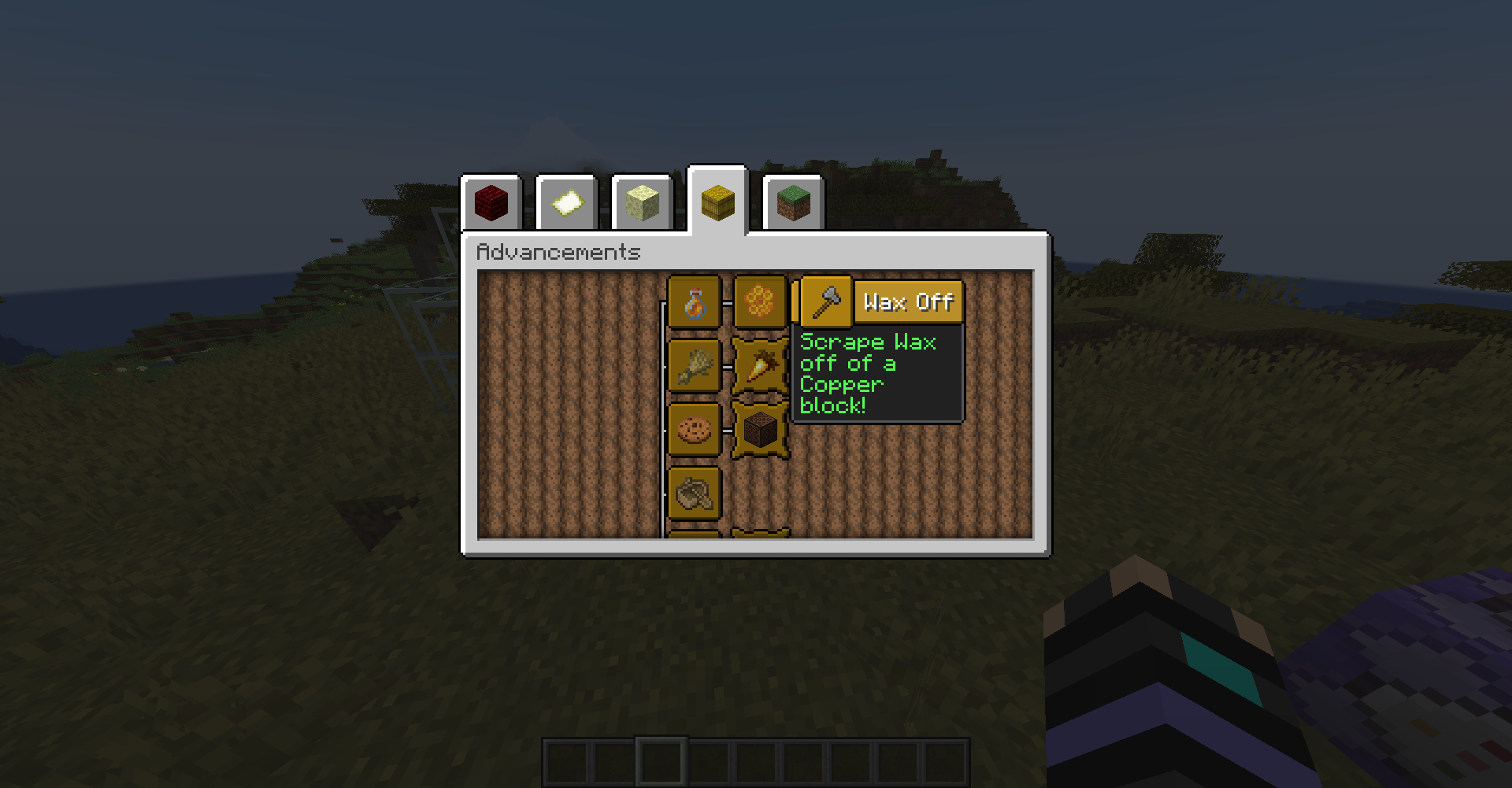 The Wax Off advancement description is: "Scrape Wax off of a Copper block!"