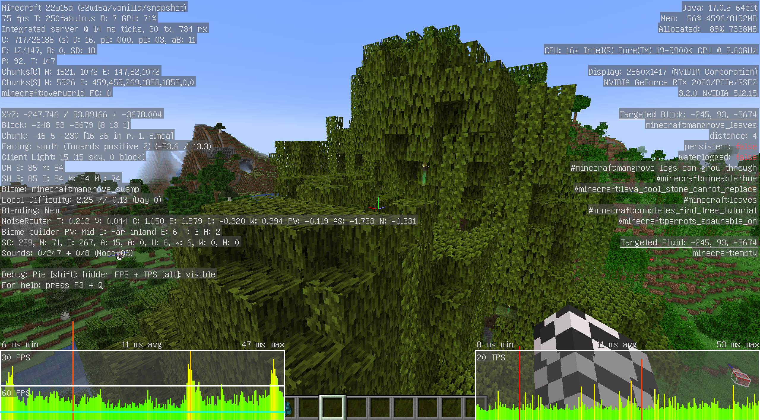 Same scene with jungle/forest biome as comparison, you can see it still performs bad but not as terrible as a mangrove swamp: