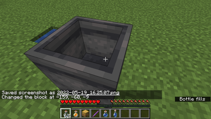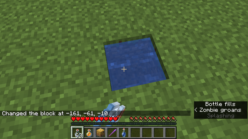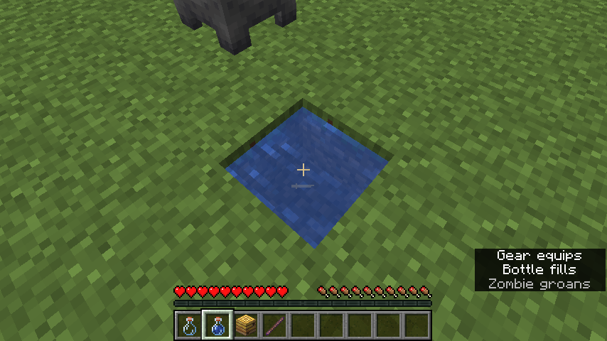 If a single water bottle is filled from a water block, the Gear equips sound is played. This does not appear to apply to stacked bottles, and water cauldrons are seemingly unaffected.