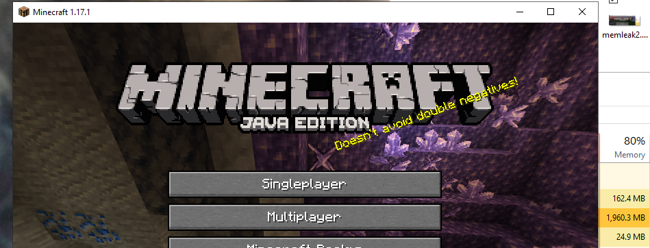 and I know the hardware I play minecraft on isn't particularly good but the game has run fine as long has I had a mod like optifine installed the game ran fine and 1.15 to 1.17 ran fine without mods due to all the bug fixing and optimizations in 1.15, but this memory leak causes the game to run at ~10fps even with mods like sodium and lithium (all tested versions were unmodified vanilla MC)