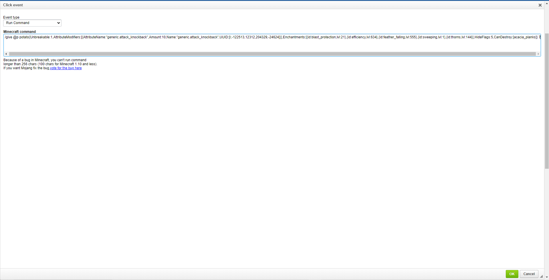 When i write command in written book creator i see message: "Because of a bug in Minecraft, you can't run command longer than 256 chars (100 chars for Minecraft 1.10 and less). If you want Mojang fix the bug,vote for the bug here"(here link). I write about this bug here. What i did wrong? :/