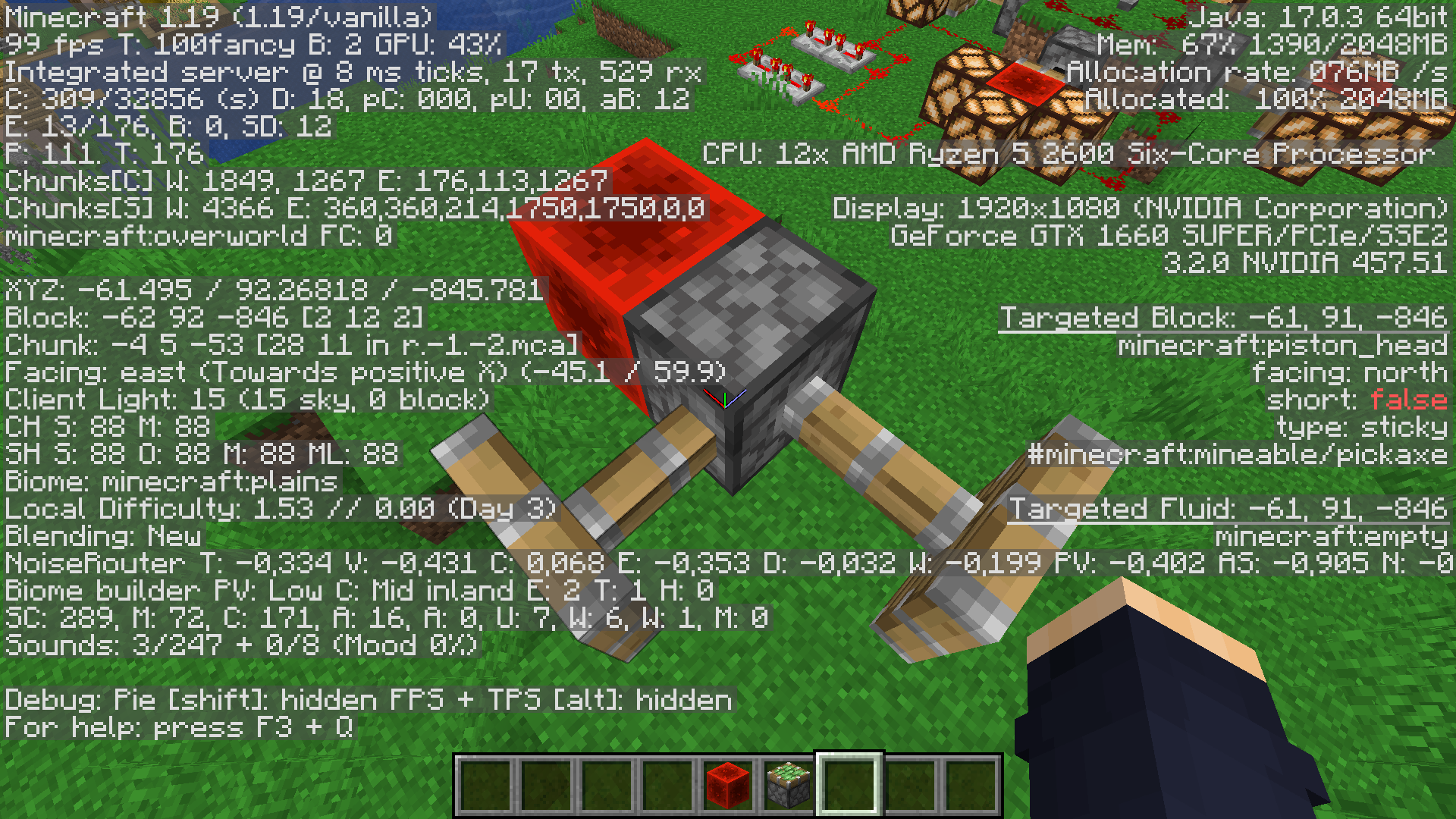 When a piston is placed by a player who then turns their head away before the server registers the placement, a second piston head will visually appear extending from a different side of the piston. This piston head is only the result of a client-server desync, since right-clicking on it or saving and reloading the world makes it disappear.
