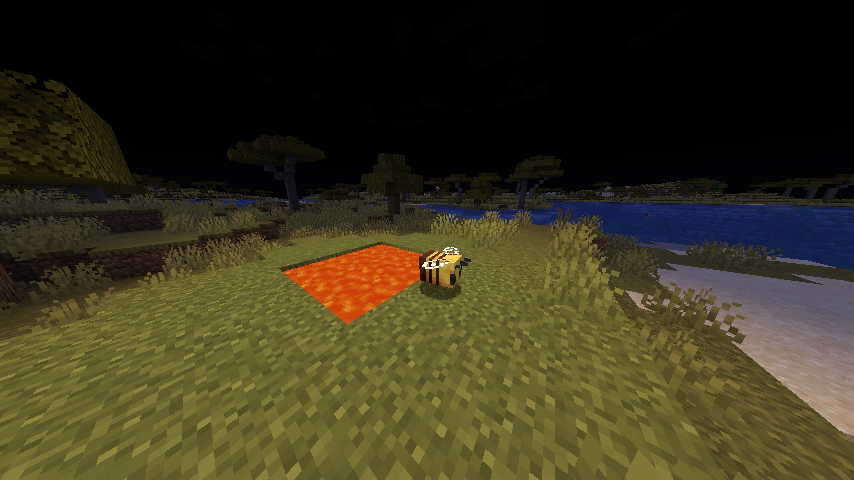 I noticed a bug and looked it up and have seen a recent report on it. I was testing around with mob behavior, and when I got to bees, I accidentally came across something. Initially when spawned, bees roam freely, or roam close to said nest or hive. But, when a bee comes close to lava, it completely freezes. After a while the animation itself begins to stop and it is left there like an armor stand or nonmoving entity. After a bit of investigation, I found that the bee freezes once within a 1 block span of the lava. I even noticed the damage ticks being negated from burning in some circumstances when the animation froze. The bee did seem to be doing its bounce though without flapping its wings, even without moving whatsoever. I also discovered that the bee once interacted with will begin its animation again and will also go back to normal once pushed 1-2 blocks.