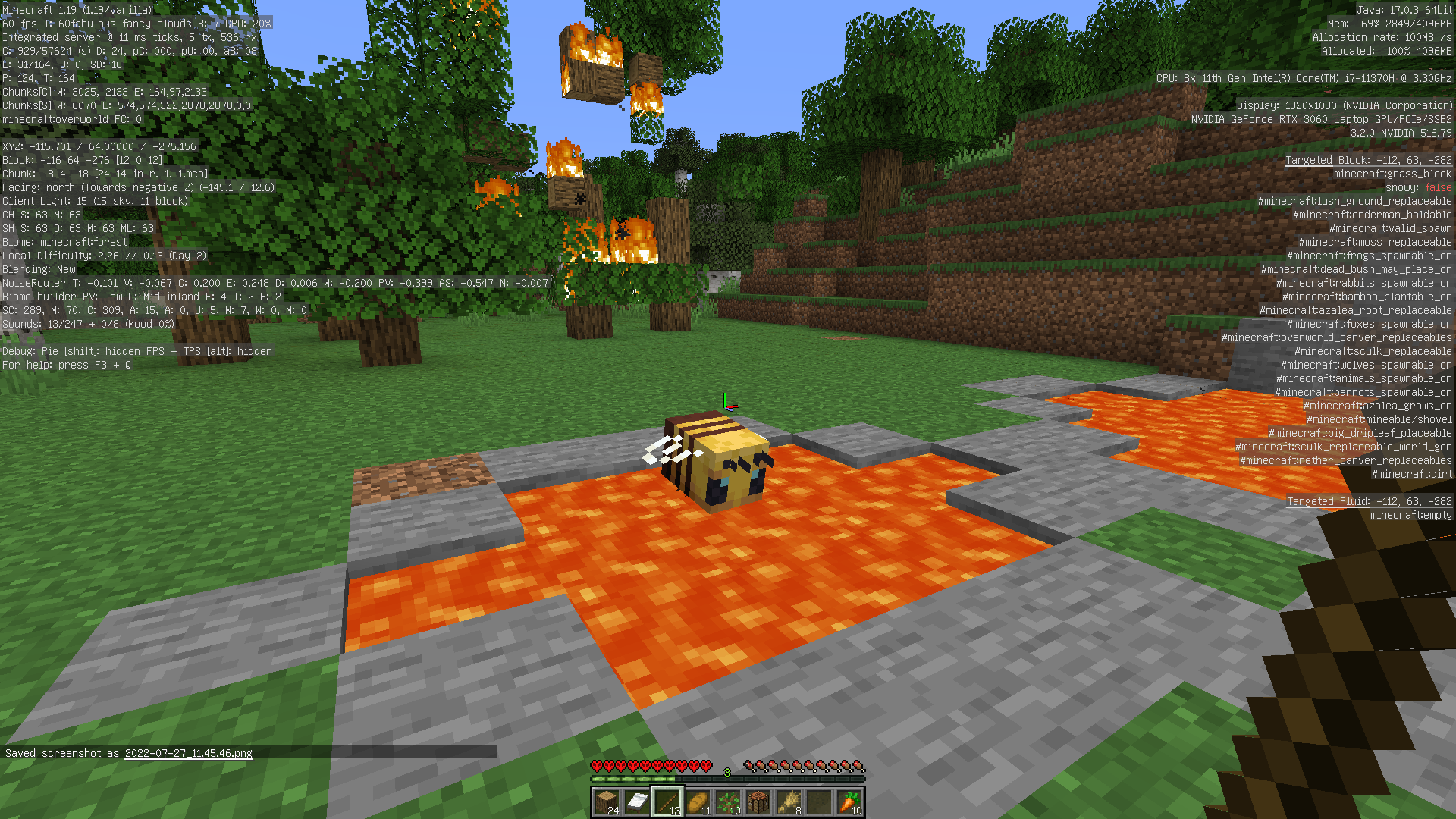 When I happened upon this pool of lava that had lit some of the trees on fire nearby, some where already destroyed by the time I got their; I had happened upon this bee that seems hovering in place right mostly over lava. I walked into it & now it is completely hovering over lava, and still seemingly stuck in place. I don't know if this is a bug, or oversight, or perhaps an intended feature.