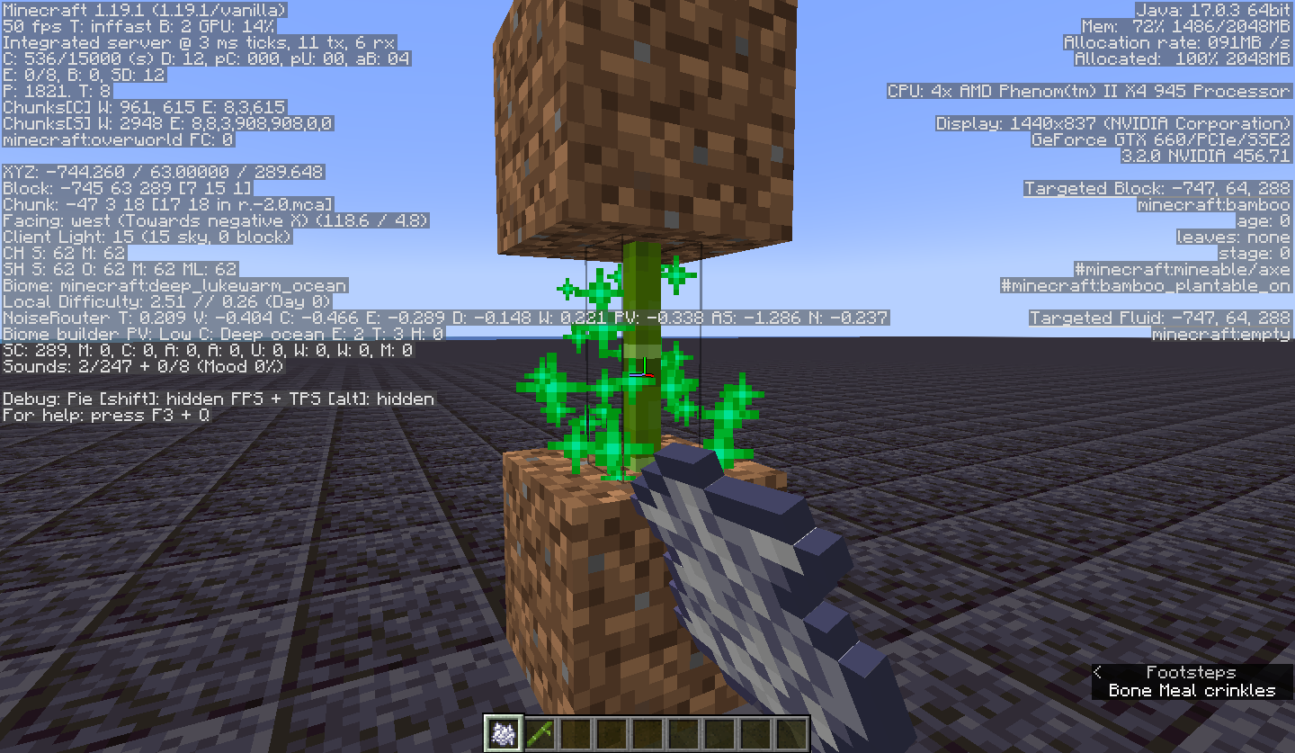 When there is a block of any type above a bamboo. (Minecraft: Bamboo) Not to be confused with a Bamboo Sapling (Minecraft: Bamboo_Sapling) and you use bonemeal on it the bonemeal is used and wasted.