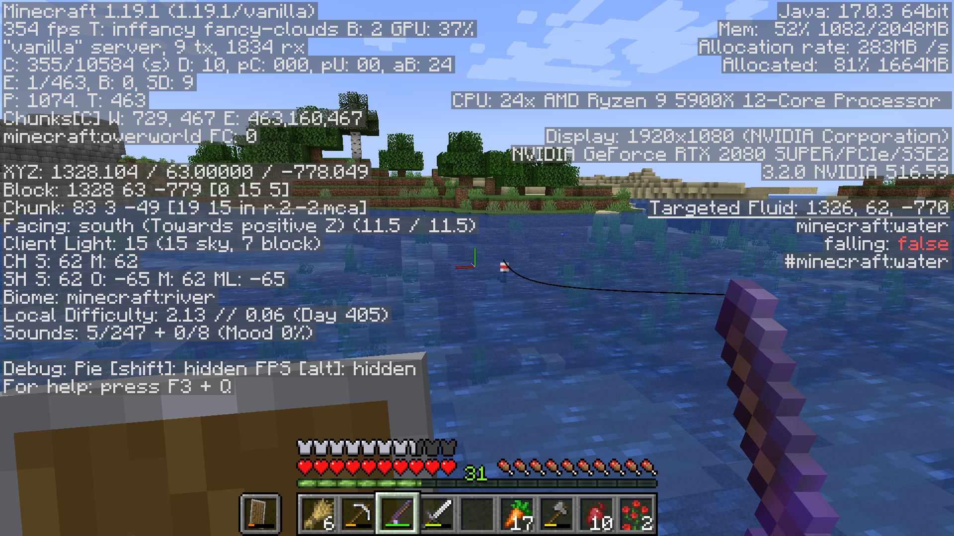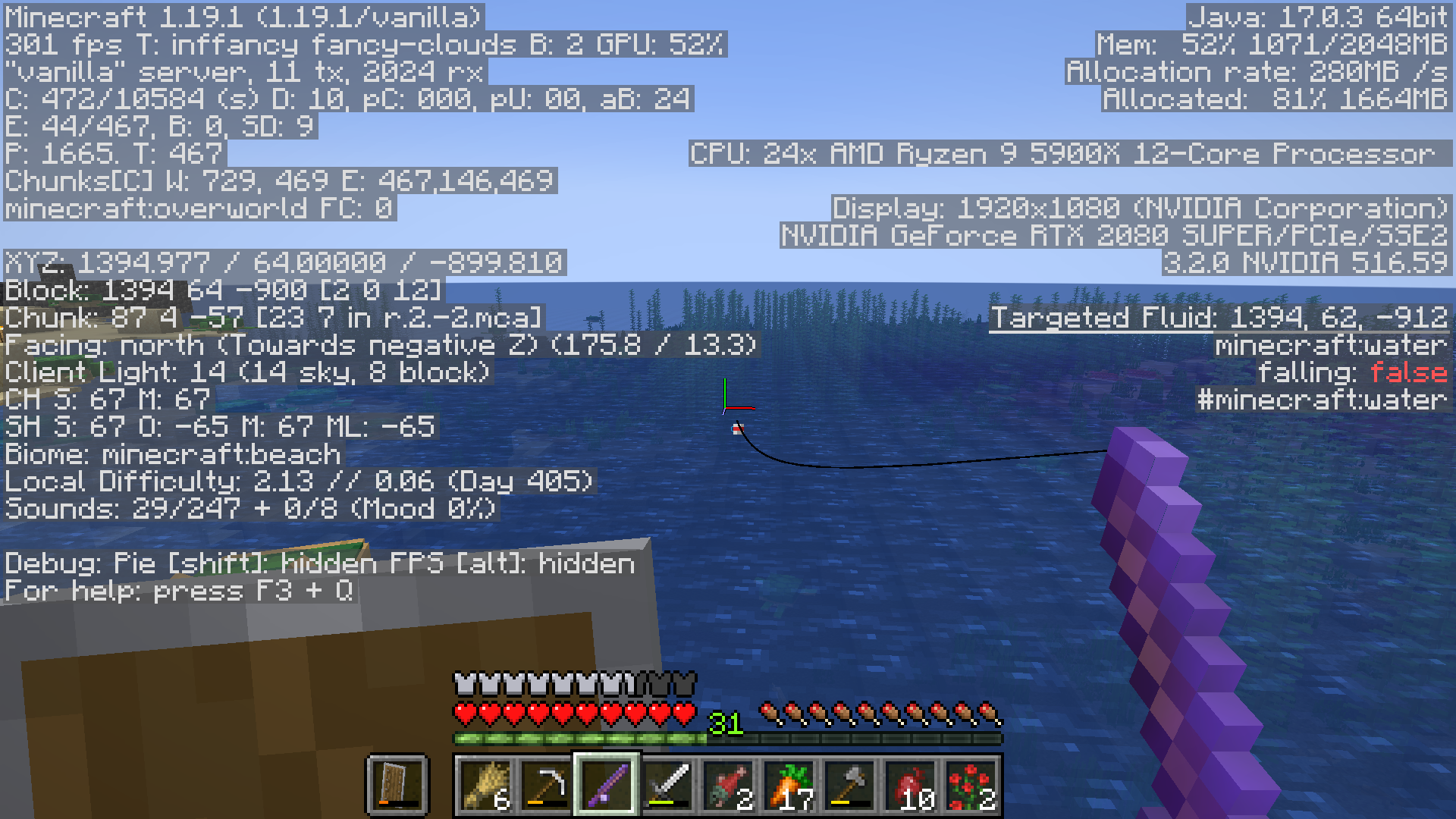 Could you please attach screenshots (with the F3 screen enabled) of the beach and river you are fishing in?