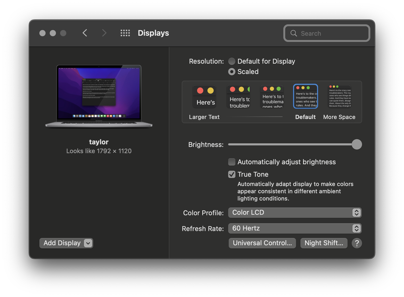Secondly, there is the apparent resolution. This started because of Apple's retina displays, and means pretty much nothing anymore. Today, in display settings, you can enable 'scaled'. Scaling to 'default' (which doesn't scale at all) says 'looks like 1792x1120' which I'll call here the 'apparent retina resolution'. This is a relic, supposedly to do with DPI; there is no other place you can even see this resolution, it means nothing. Again, macOS renders at the display resolution, just like Windows does, which is for me 3072x1920. No OS issues anywhere.