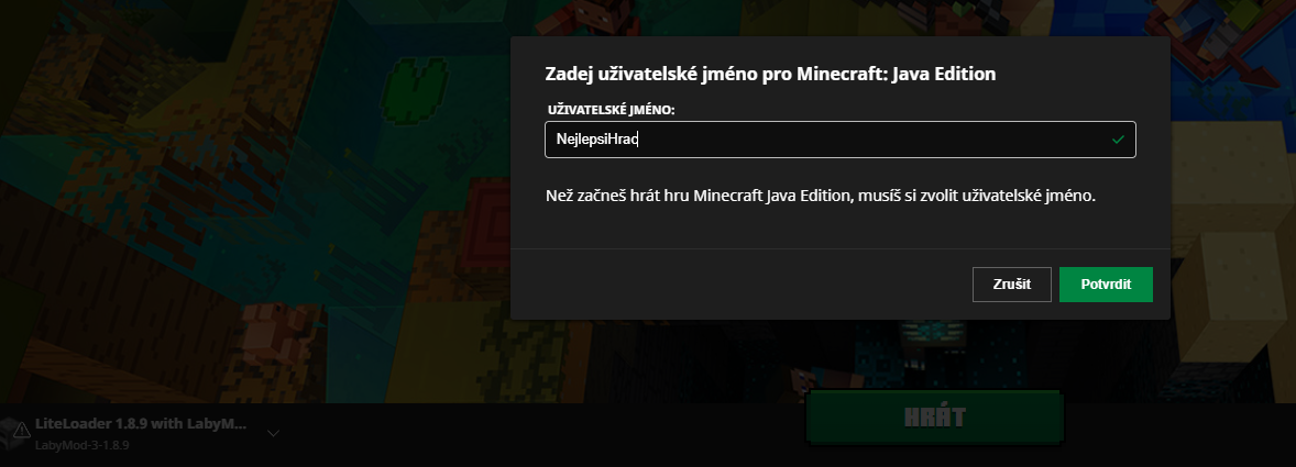 Good day, I bought minecraft and downloaded it. In order to play minecraft I have to choose a name. When I choose a name, only a problem appears that says "Try restarting the launcher, if it doesn't solve it, write to mojang.." It didn't help, I can't change the name even through minecraft.net, I can't even change it through another web browser (Google chrome , Firefox), I've been playing minecraft for a long time, but only through a warez account.. Otherwise, I've tried absolutely everything, running through the administrator or something like that.. Thank you very much and please help. And on minecraft.net when I want to change the name, I click on "change name" and only the frame is green then gray then green... there's just a mistake somewhere. It can't be done via phone or laptop. I am using Labymod and new version of Java..