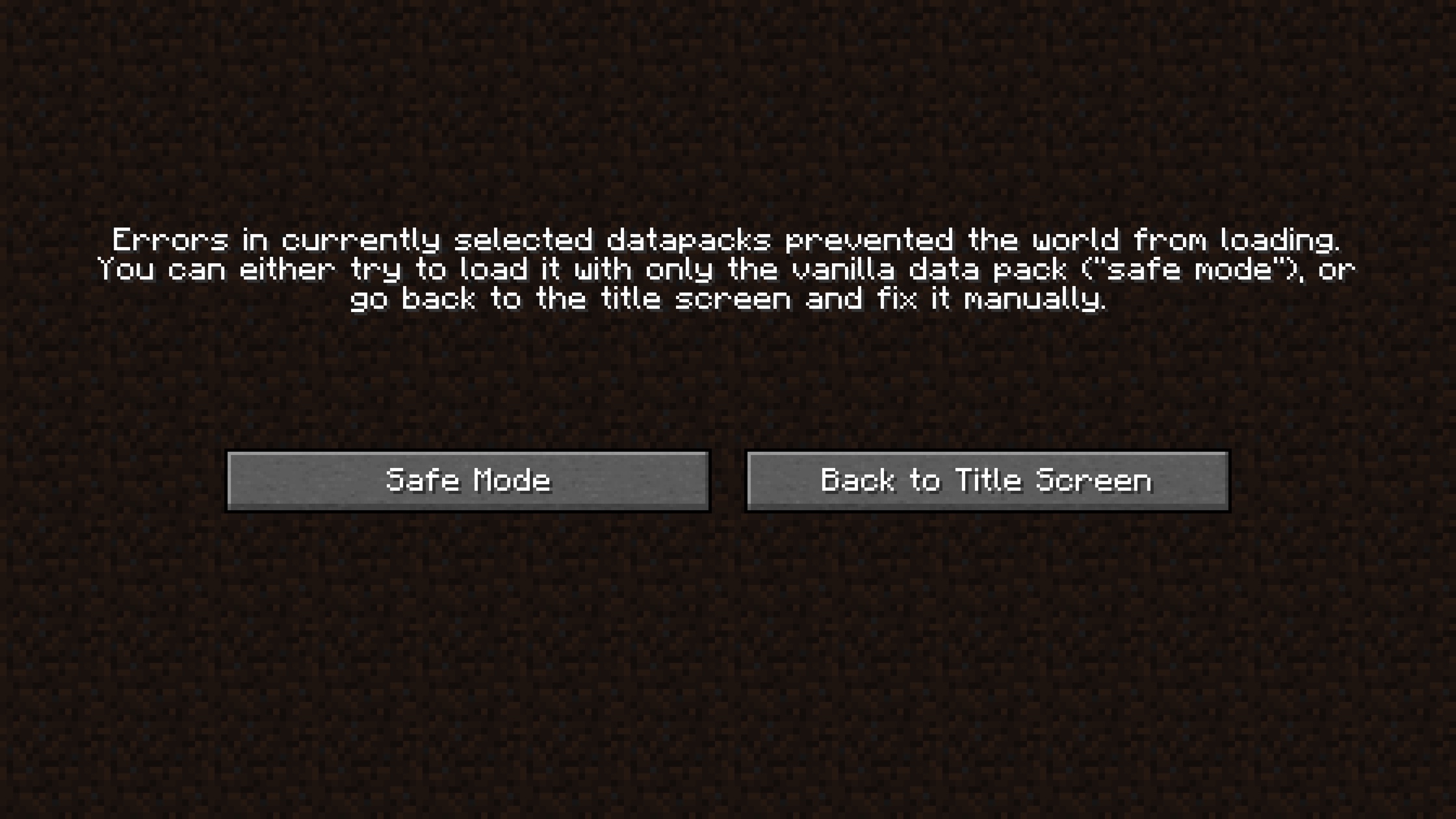 When I try to log into the world, it loads for a split second and then appears with the error message attached in the screenshot. When I press the "Safe Mode" button, nothing appears to happen at all. When I press "Back to Title Screen," it takes me back to the title screen as expected, but gives no hint on how to fix the issue. I cannot create a backup of this world. When I try to load an older version of the world that I have saved on a USB, it works fine (again, no mods installed.)