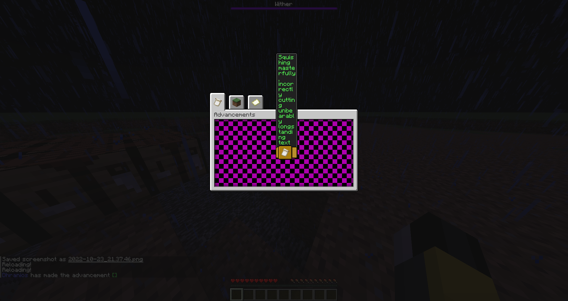 The width of an advancement's description is set to the width of the icon and title of the advancement combined; any words that do not fit within this width get cut onto the next line, making reading short-title advancements' long-description words unnecessarily hard.