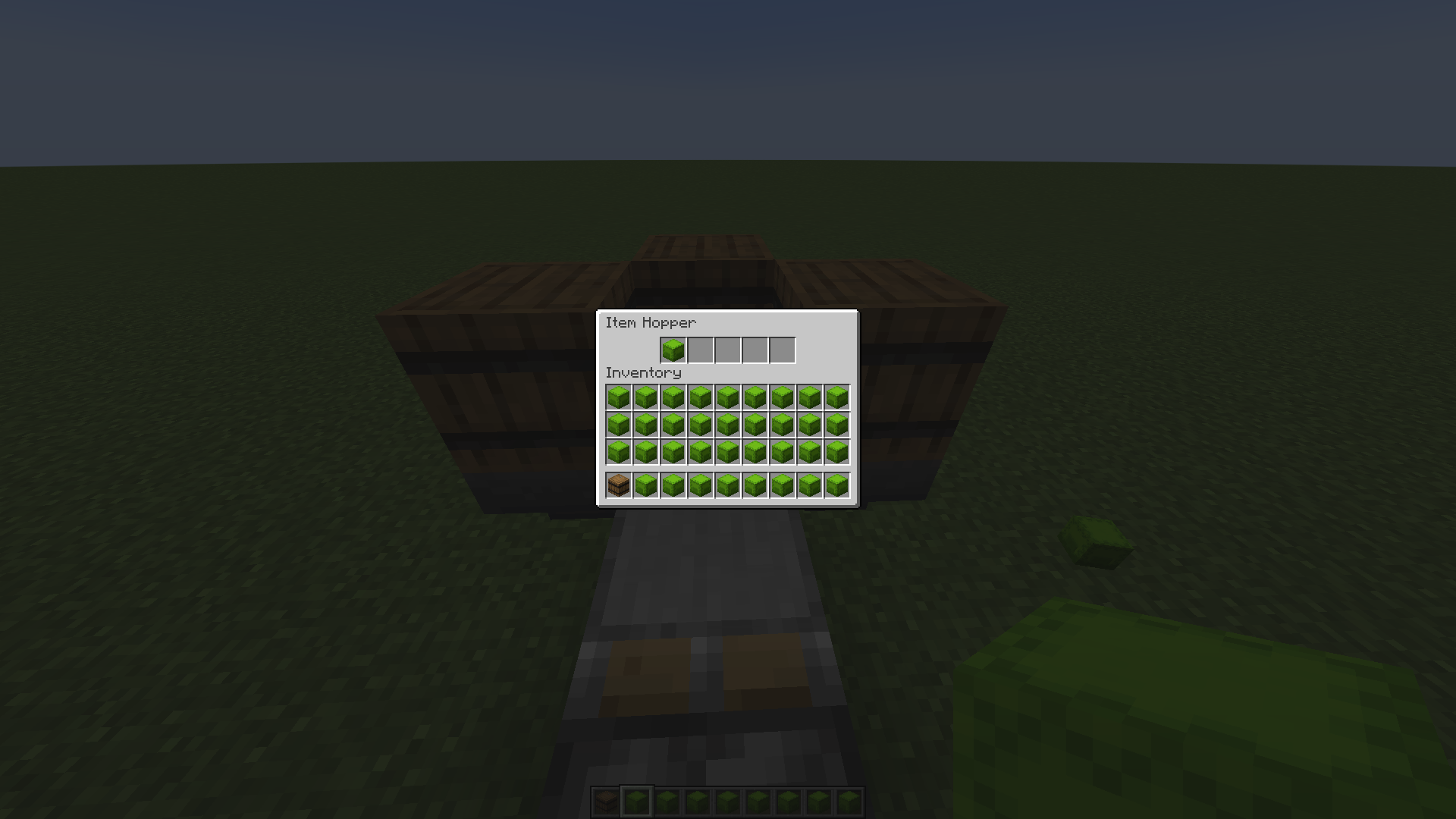 Hoppers with barrel facing downwards on top picking up items. If you use a sticky piston to push a block into a shulker box to break it, it sometimes ends up in the close by hopper that has barrel on top.