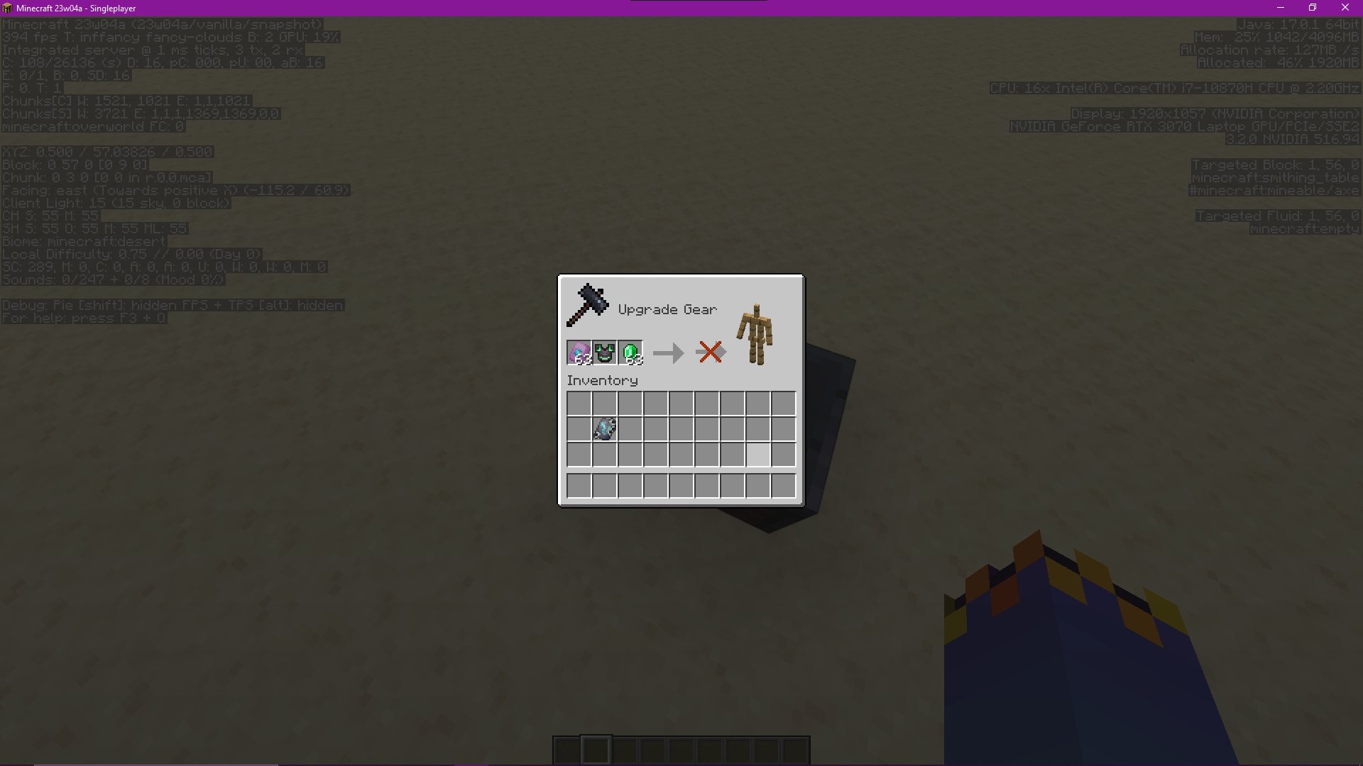 (with the 1.20 datapack enabled) When attempting to apply the same trim to an item multiple times, a crossed-out arrow appears. However, this doesn't end up on top of the default arrow, instead it appears in the output slot, resulting in two arrows: