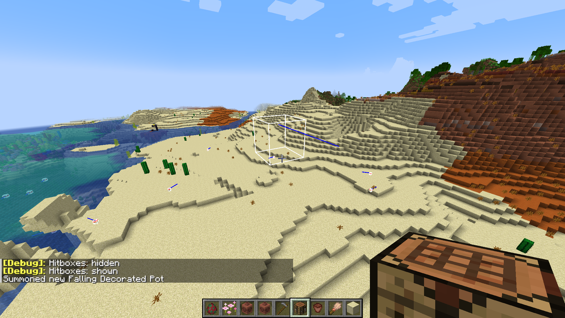 typing the command "/summon minecraft:falling_block ~ ~ ~ {BlockState:{Name:"minecraft:decorated_pot"}}{}" will summon a falling block entity set as a decorated pot, but the entity will be invisible (setting the NoGravity tag to 1 with F3+B enabled will allow for easier visibility of the issue, though the bug is present regardless.). When the entity hits the ground, it creates a visible block.