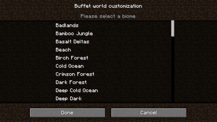 The Cherry Grove biome does not appear in the 'buffet world customization' screen when creating a World Type: Single Biome. This is not consistent with every other Minecraft biome and unless explicitly noted otherwise, would appear to be a bug or oversight.
