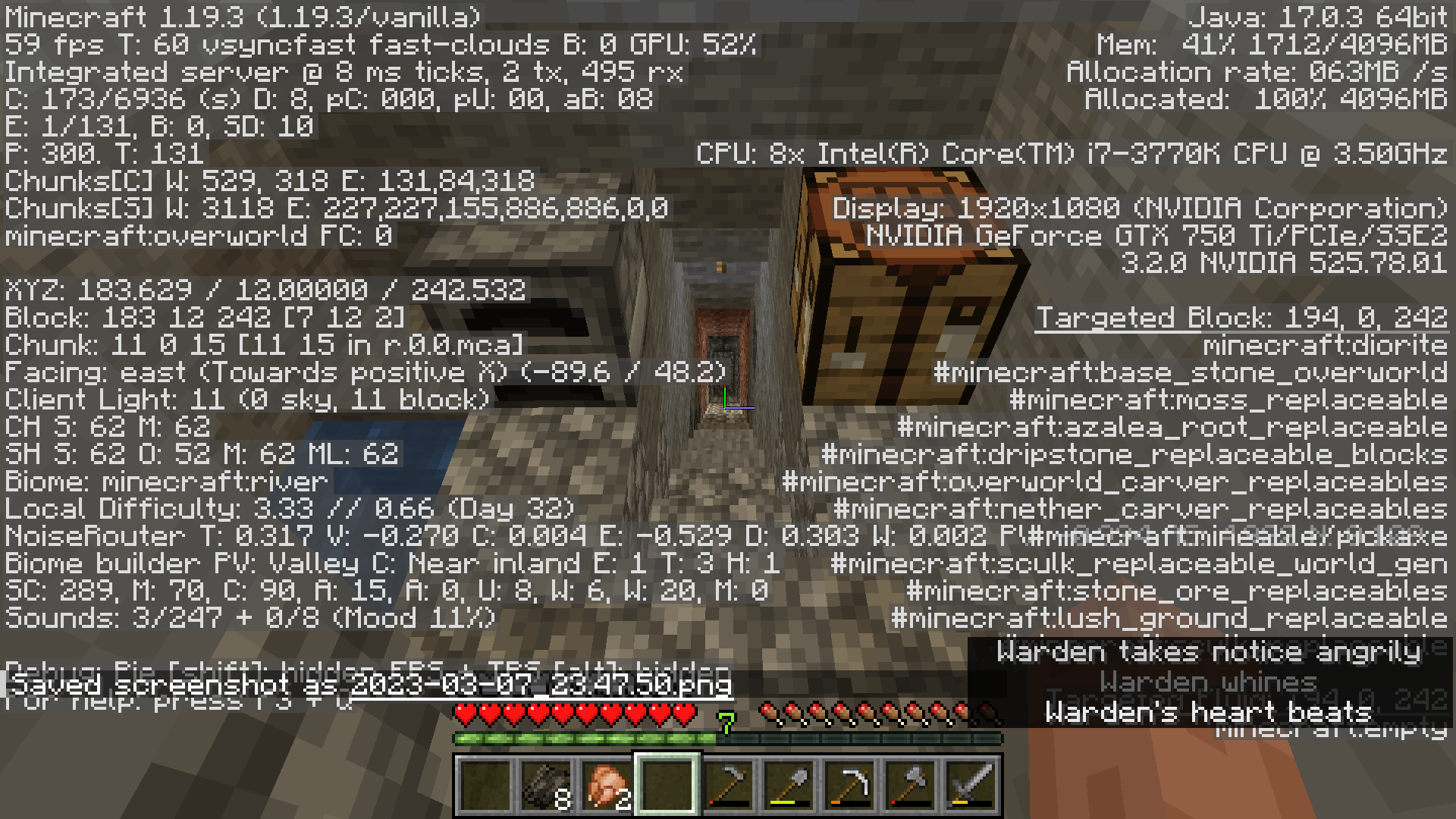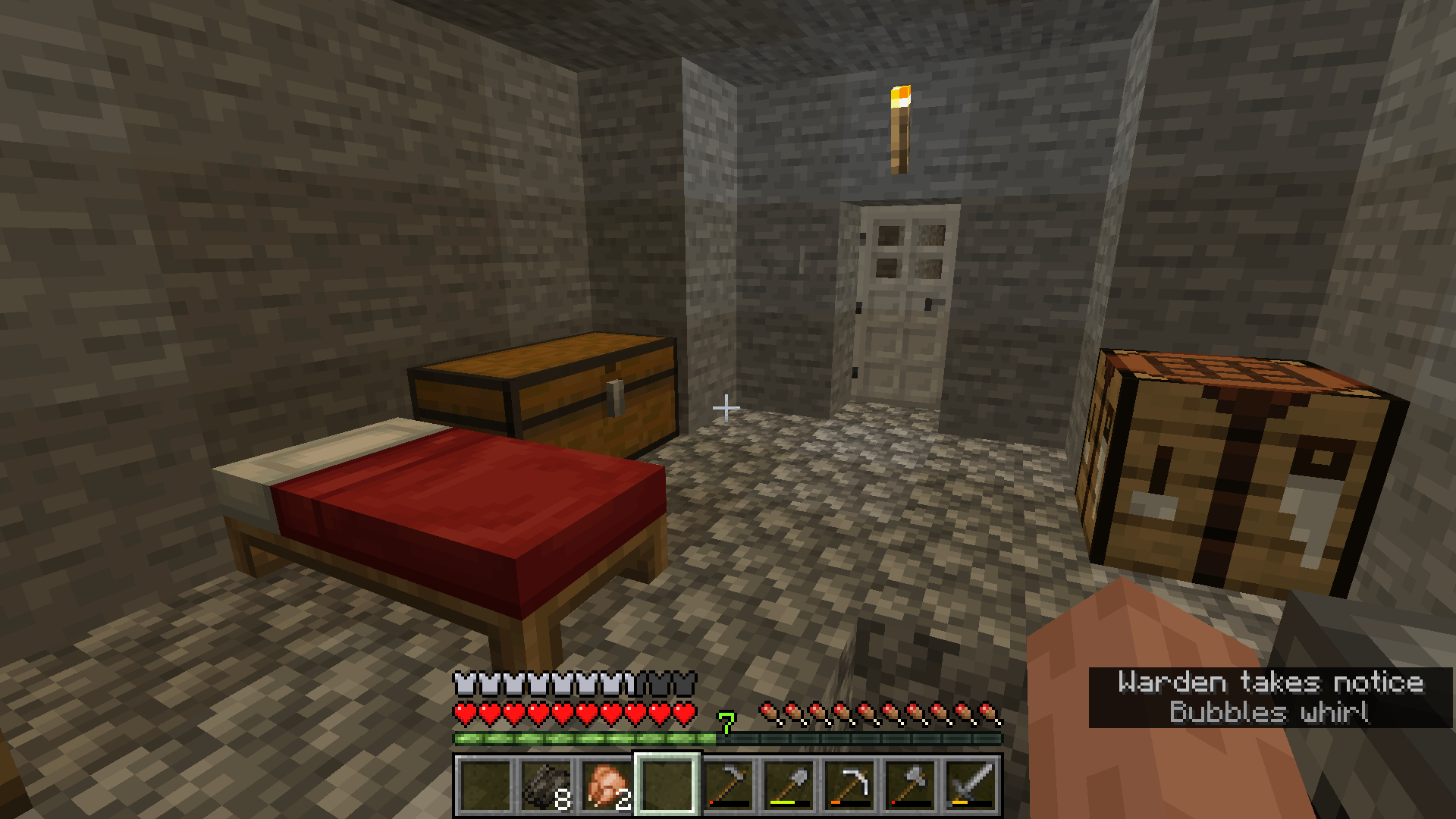 That's why it says "Warden Takes Notice" because I can still hear the Warden being agitated and active despite the fact that I am (in Minecraft terms) basically a MILE away from the creature, and I know this because I went back down the staircase only to find out the Warden was still mostly around the Deep Dark area.
