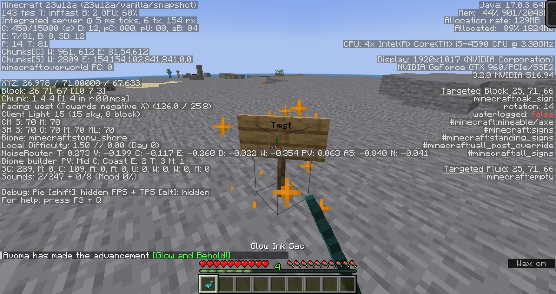 Take note as to whether or not the "Glow and Behold!" advancement is granted when interacting with waxed signs while holding glow ink sacs.