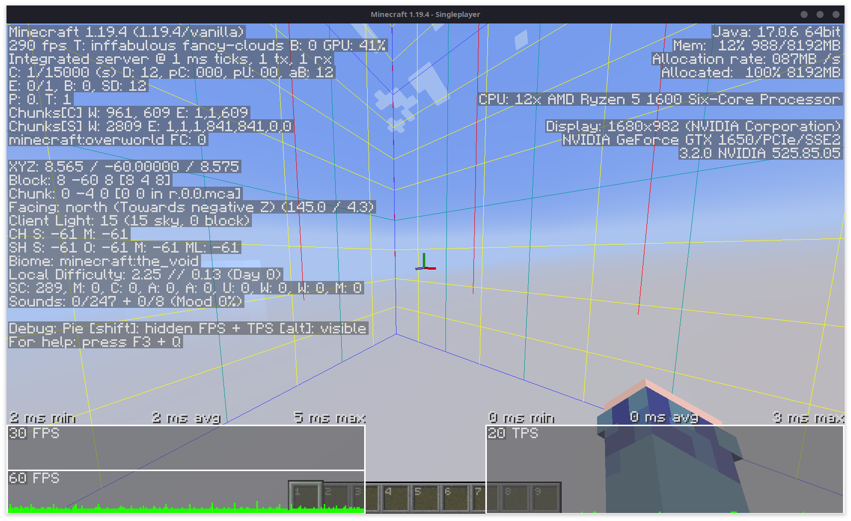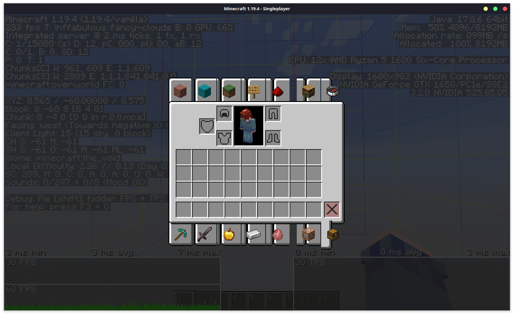 When the inventory is open, whether it be survival or creative, the game consistently slows down a minor amount. This is most easily observed in an empty world as a control environment, though in certain specific situations the lag caused by this can cause the game to slow to a halt, but only when the screen is open. Attached are two images, with and without the inventory open. Note the difference of 1ms in the average frametime.