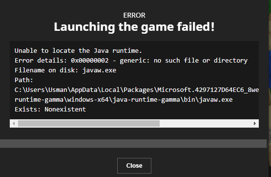Path: C:\Users\Usman\AppData\Local\Packages\Microsoft.4297127D64EC6_8wekyb3d8bbwe\LocalCache\Local\runtime\java-runtime-gamma\windows-x64\java-runtime-gamma\bin\javaw.exe