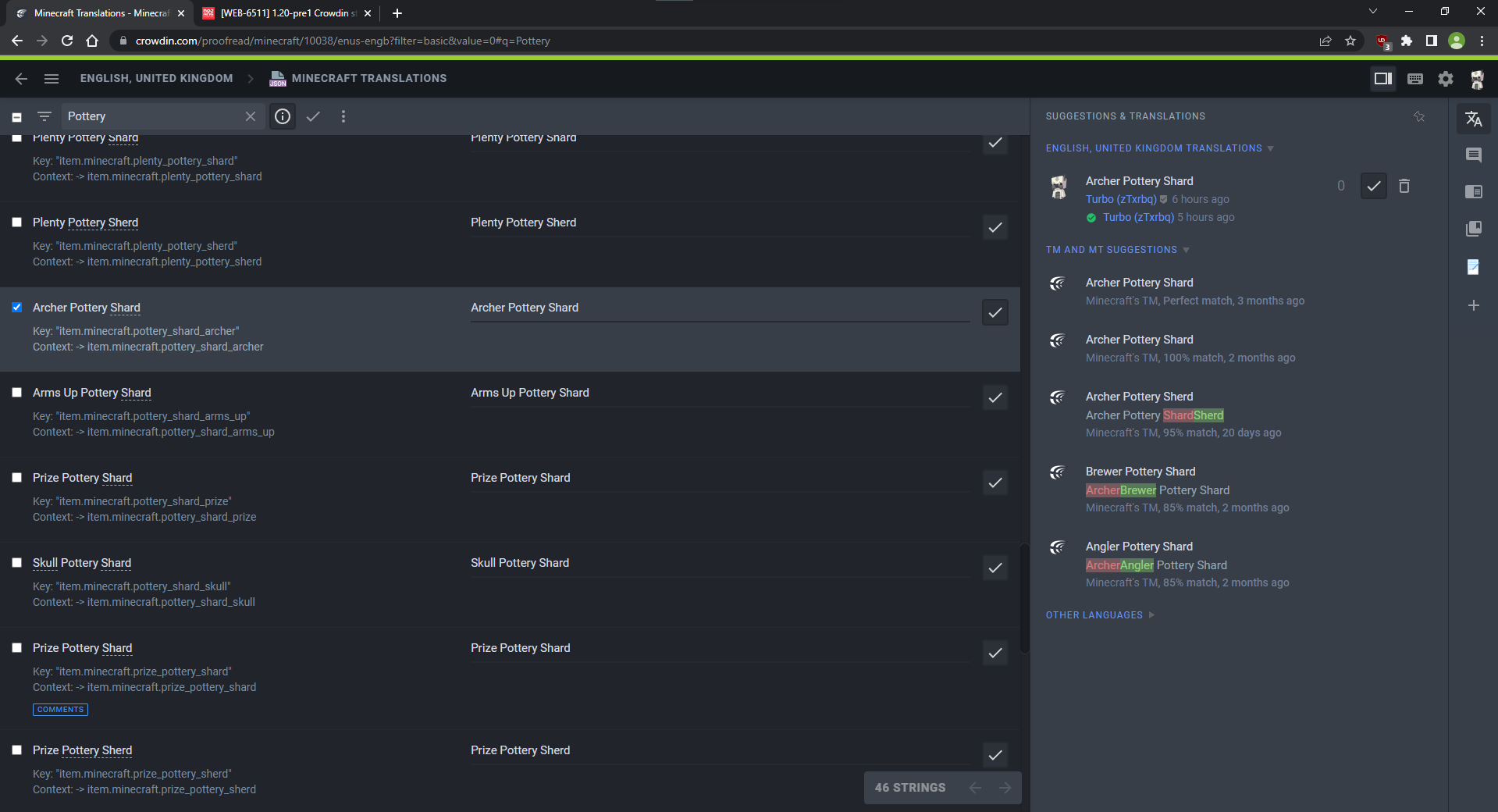 The new Crowdin strings for 1.20-pre1 reintroduced all outdated "shard" strings, which now coexist with the "sherd" strings of 23w16a; in addition, four pottery shard strings with mixed-up invalid translation keys were uploaded, which are not present in-game.