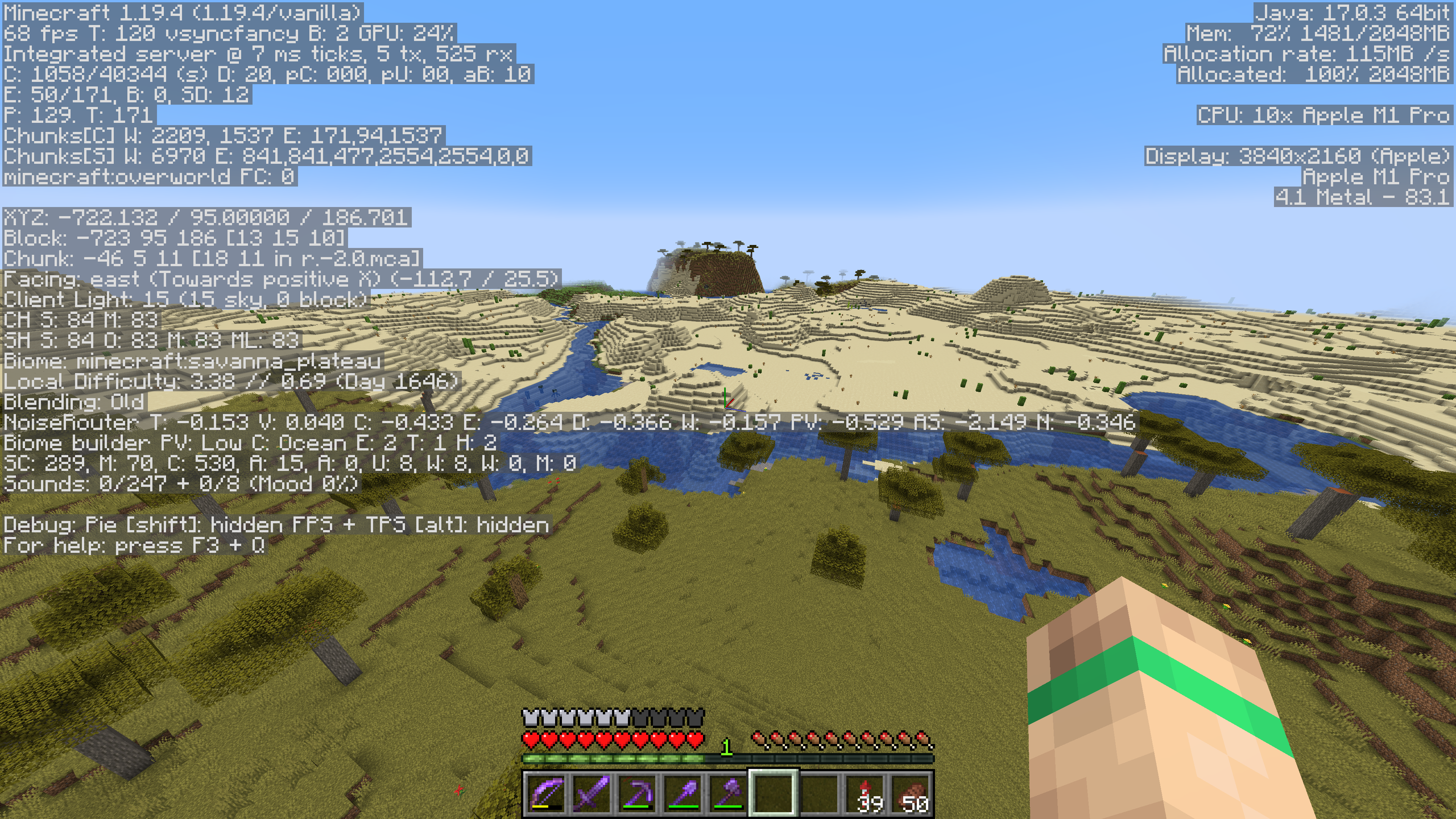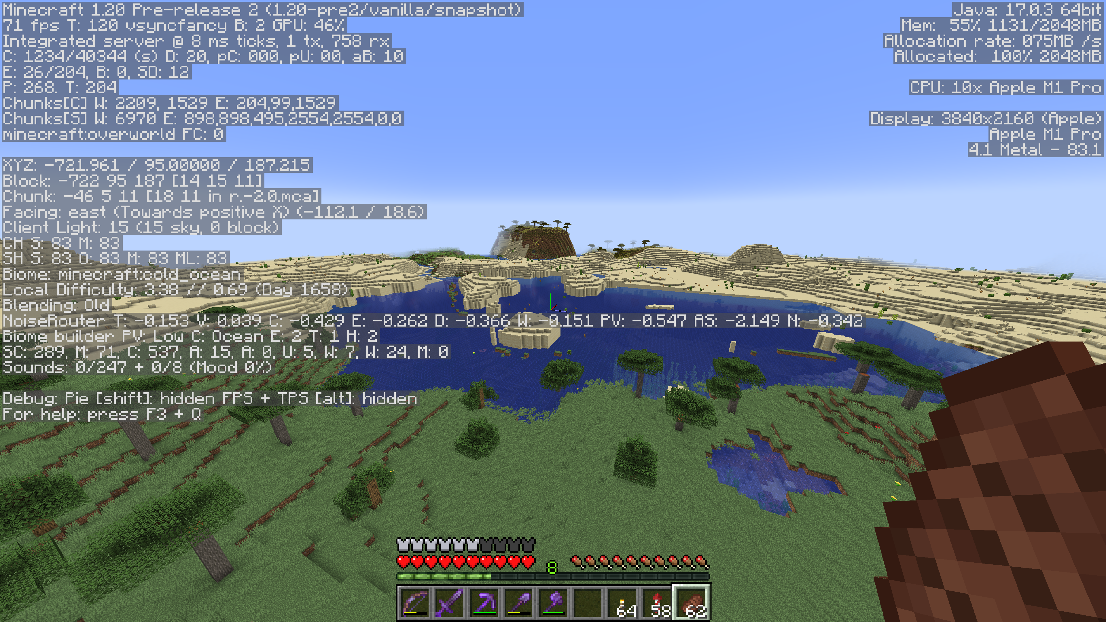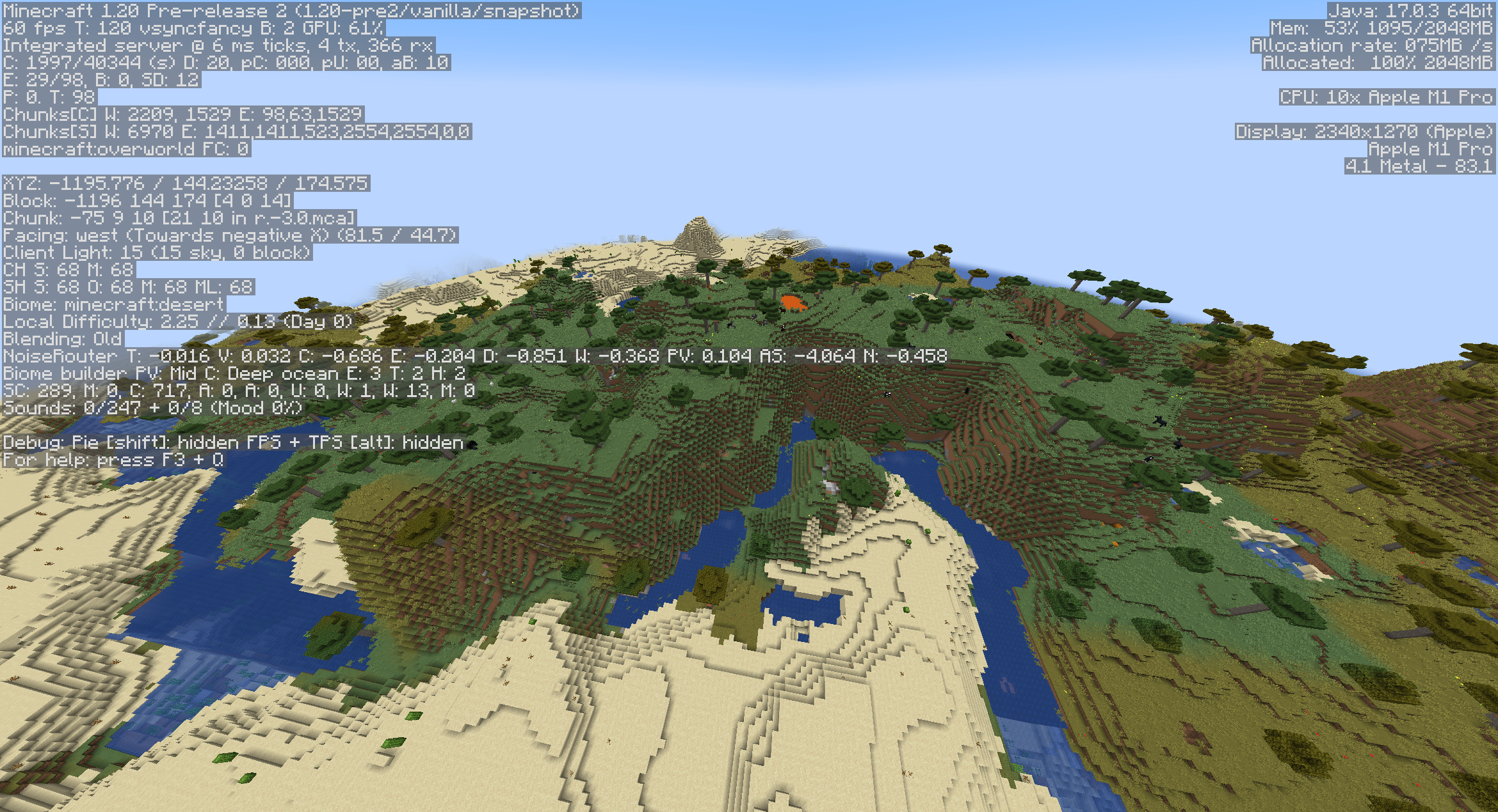 The attached screenshots show portions of a desert and savanna biome that were generated in version 1.19.4, and the same areas in version 1.20 pre2. In the 1.20 pre2, the area was partially regenerated / overwritten by various ocean biomes (Cold Ocean, Deep Cold Ocean).