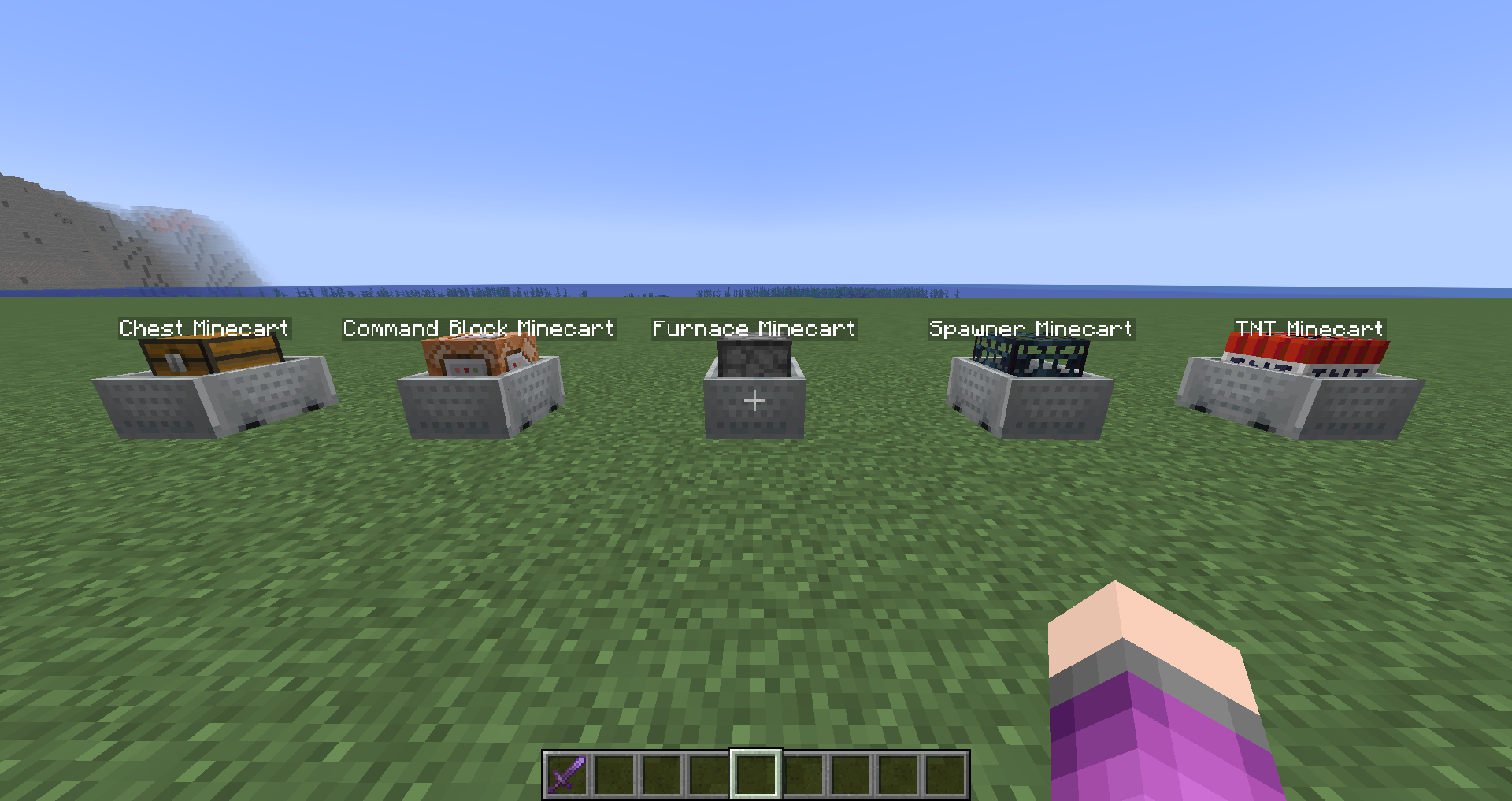 /summon minecraft:chest_minecart ~2 ~ ~-6 {NoAI:1b,Silent:1b,CustomNameVisible:1b,CustomName:"{\"text\":\"Chest Minecart\"}"}/summon minecraft:chest_minecart ~2 ~ ~-6 {NoAI:1b,Silent:1b,CustomNameVisible:1b,CustomName:"{\"text\":\"Chest Minecart\"}"}/summon minecraft:command_block_minecart ~2 ~ ~-3 {NoAI:1b,Silent:1b,CustomNameVisible:1b,CustomName:"{\"text\":\"Command Block Minecart\"}"}/summon minecraft:command_block_minecart ~2 ~ ~-3 {NoAI:1b,Silent:1b,CustomNameVisible:1b,CustomName:"{\"text\":\"Command Block Minecart\"}"}/summon minecraft:furnace_minecart ~2 ~ ~ {NoAI:1b,Silent:1b,CustomNameVisible:1b,CustomName:"{\"text\":\"Furnace Minecart\"}"}/summon minecraft:furnace_minecart ~2 ~ ~ {NoAI:1b,Silent:1b,CustomNameVisible:1b,CustomName:"{\"text\":\"Furnace Minecart\"}"}/summon minecraft:spawner_minecart ~2 ~ ~3 {NoAI:1b,Silent:1b,CustomNameVisible:1b,CustomName:"{\"text\":\"Spawner Minecart\"}"}/summon minecraft:spawner_minecart ~2 ~ ~3 {NoAI:1b,Silent:1b,CustomNameVisible:1b,CustomName:"{\"text\":\"Spawner Minecart\"}"}/summon minecraft:tnt_minecart ~2 ~ ~6 {NoAI:1b,Silent:1b,CustomNameVisible:1b,CustomName:"{\"text\":\"TNT Minecart\"}"}/summon minecraft:tnt_minecart ~2 ~ ~6 {NoAI:1b,Silent:1b,CustomNameVisible:1b,CustomName:"{\"text\":\"TNT Minecart\"}"}Look at the positioning of all of the entities' name tags.