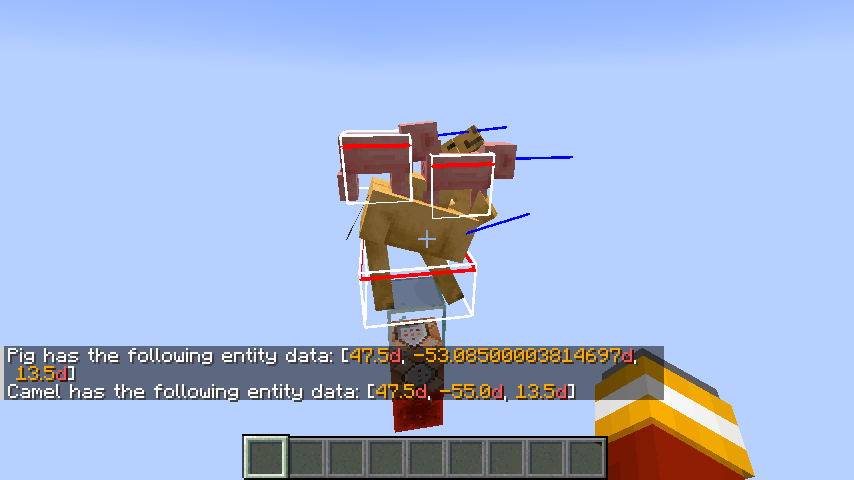 /summon minecraft:camel ~ ~2 ~ {Passengers:[{id:"minecraft:pig"},{id:"minecraft:sheep"}]}/summon minecraft:camel ~ ~2 ~ {Passengers:[{id:"minecraft:pig"},{id:"minecraft:sheep"}]}Check the Position of the camel and passenger: