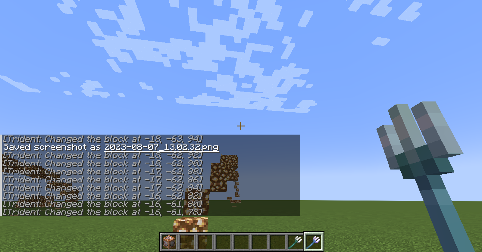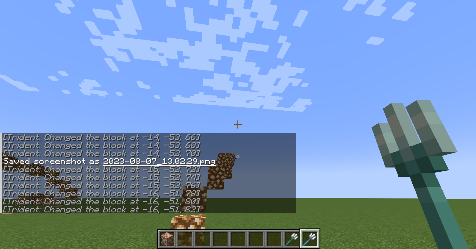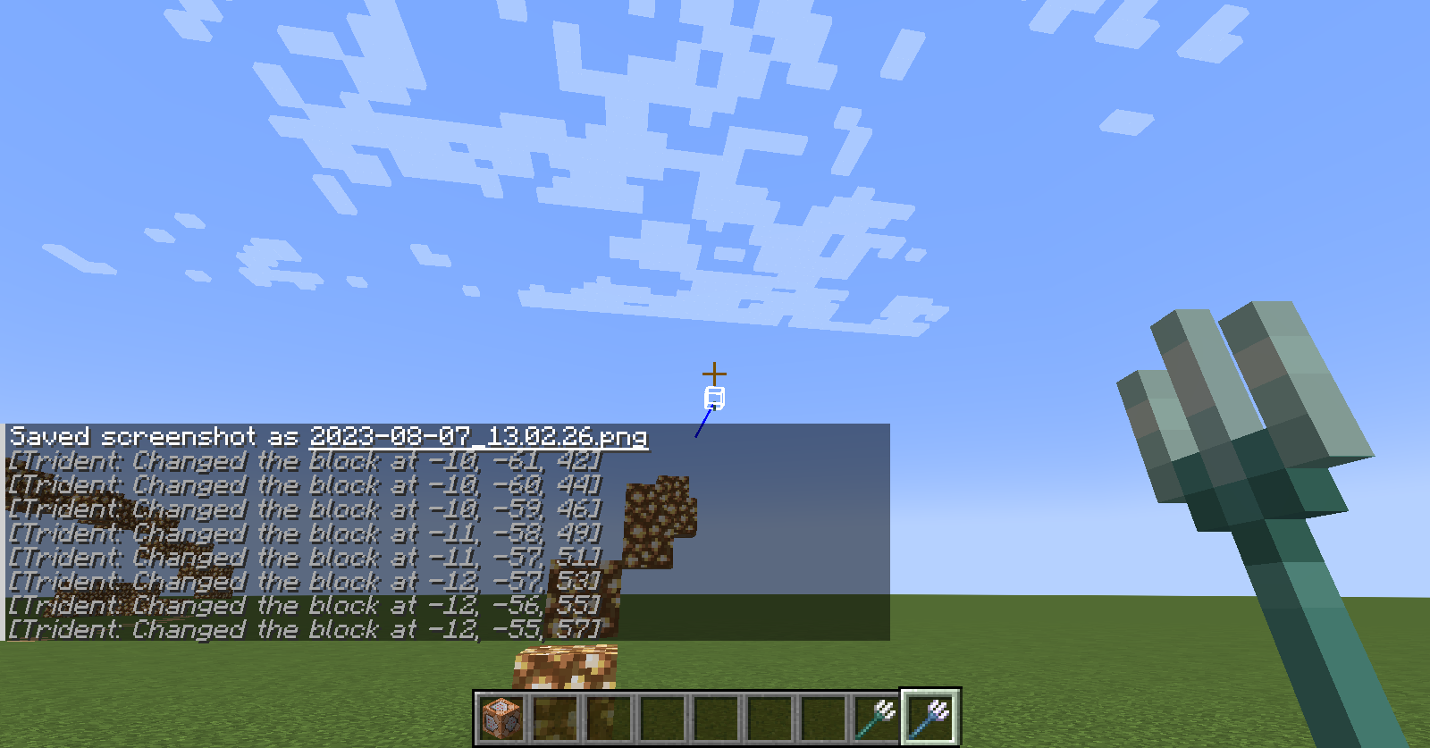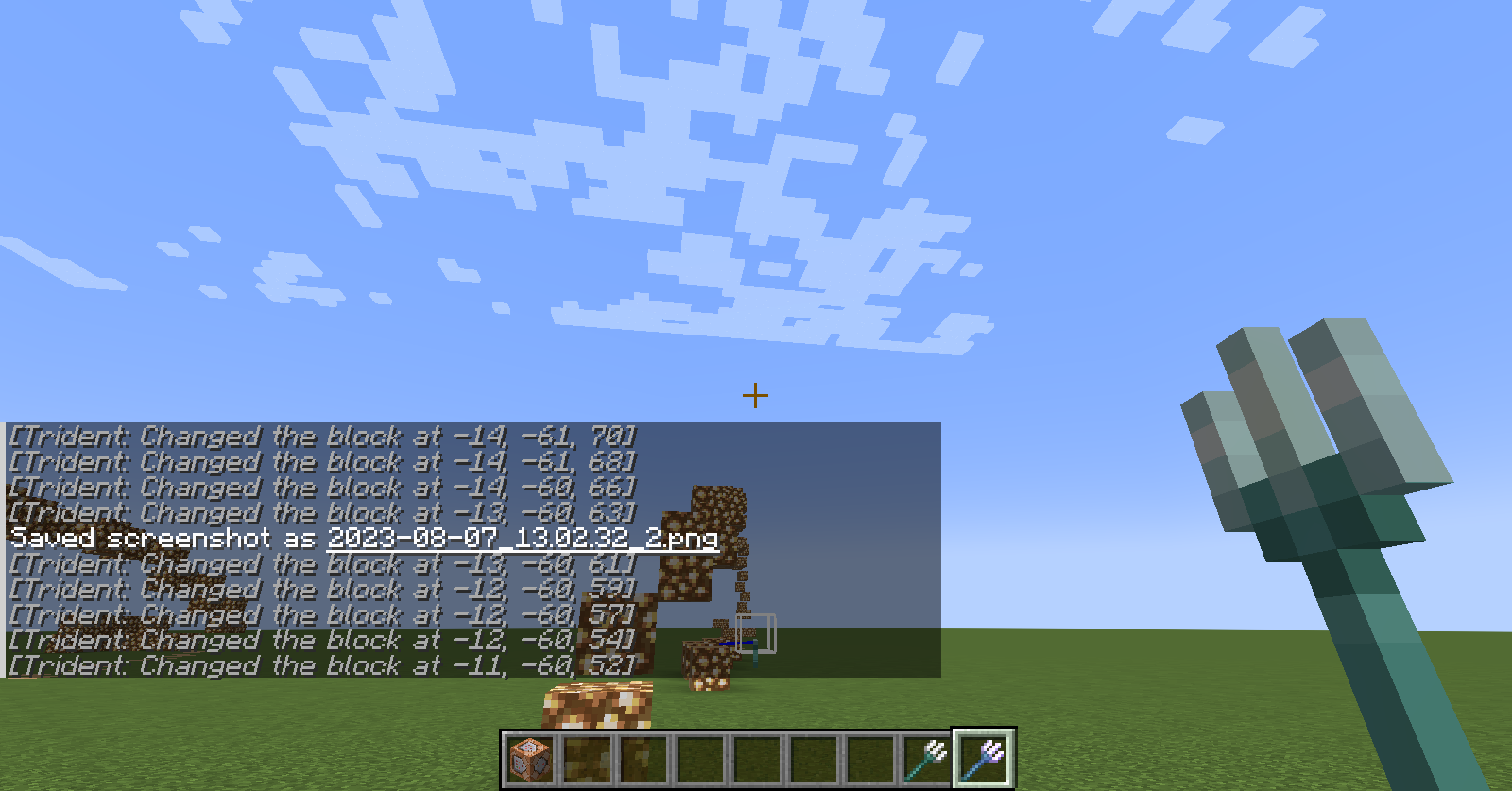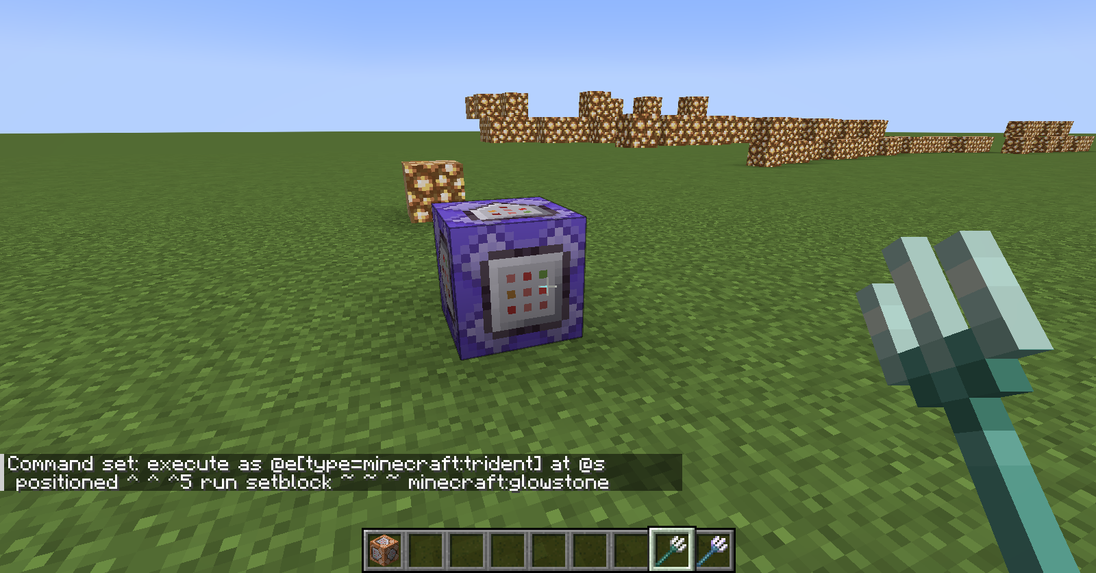 execute as @e[type=minecraft:trident] at @s positioned ^ ^ ^5 run setblock ~ ~ ~ minecraft:glowstone  Â
