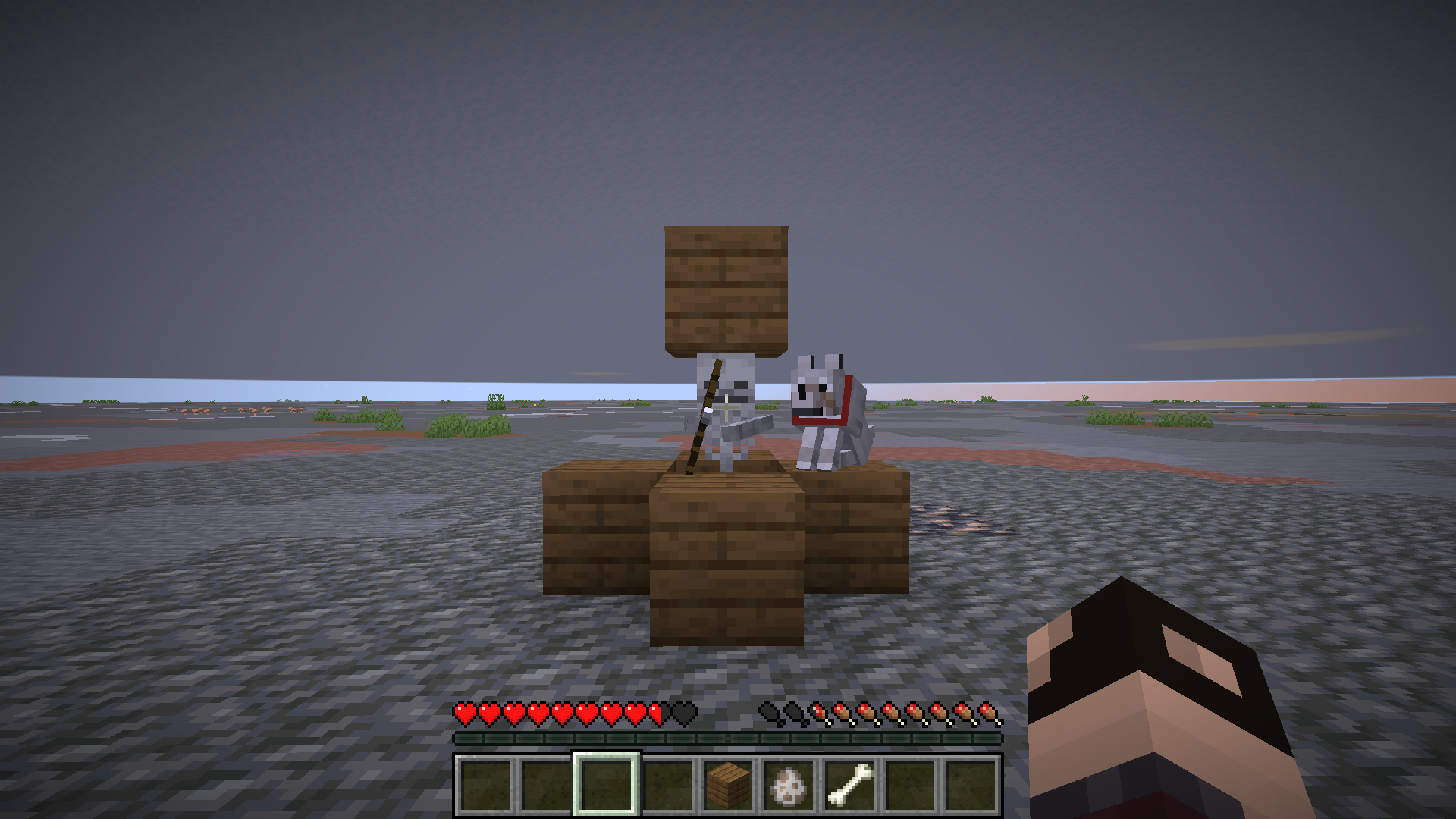 When skeletons are being repelled by wolves, they will still attempt to shoot, and in rare cases even do so successfully. This is inconsistent with how more recent mobs such as phantoms, piglins, and hoglins behave when being deterred by certain mobs/blocks.