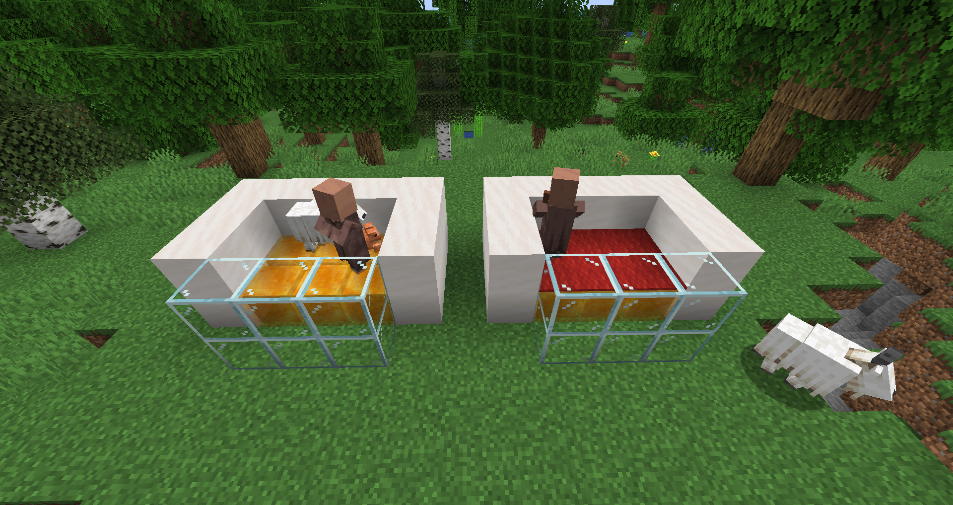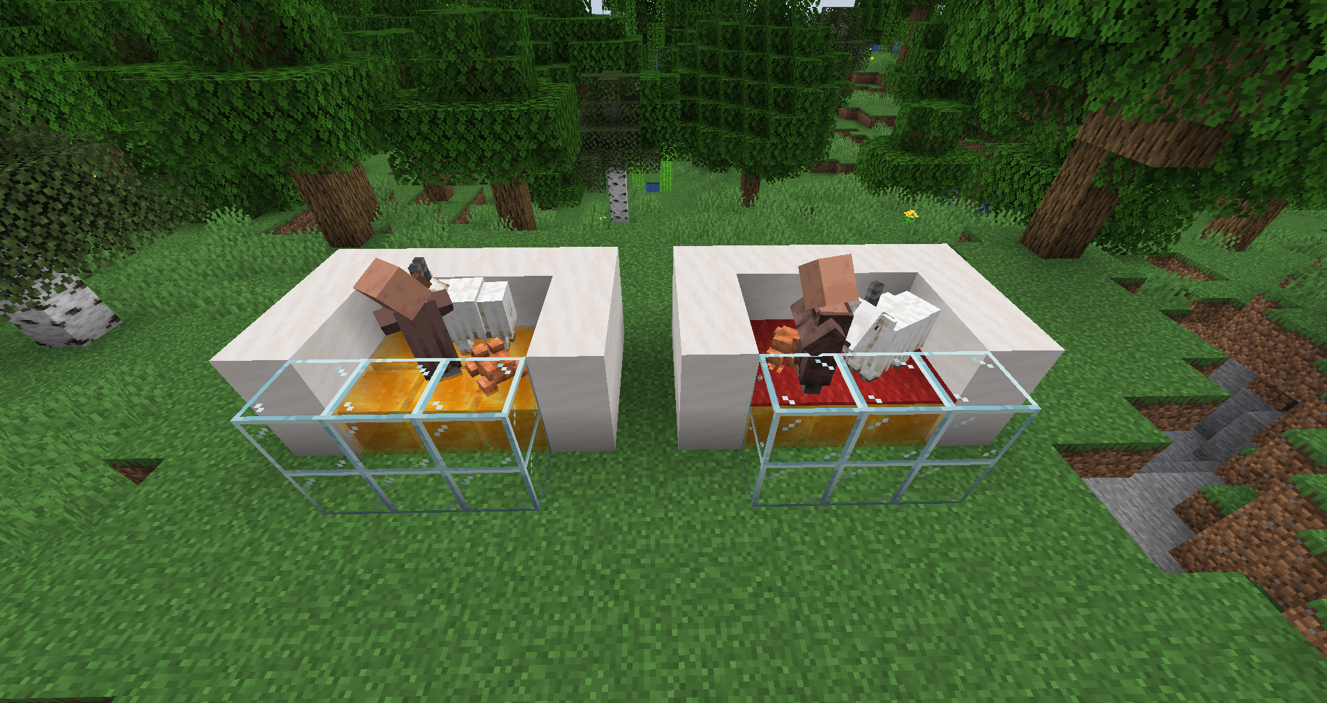 In the situation on the left, all three mobs will be trapped by the honey blocks indefinitely. In the situation on the right, the villager cannot jump out, but the frog and goat will quickly jump out.