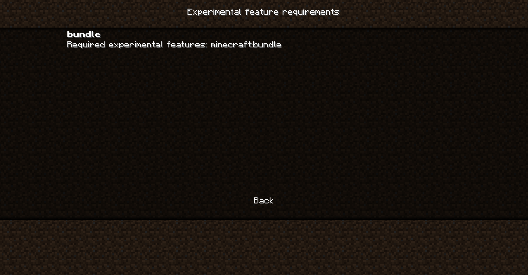 When adding a data pack to a new world, the back button on the experimental feature requirements page has no button background for certain window sizes. The dirt background appears to overlap at some point when resizing the window.