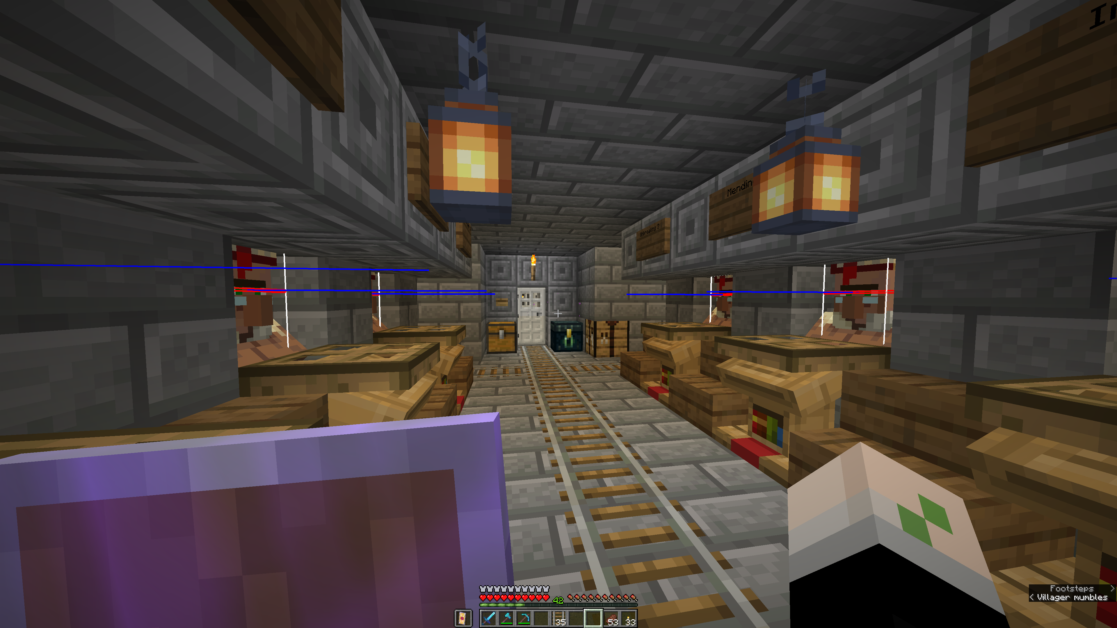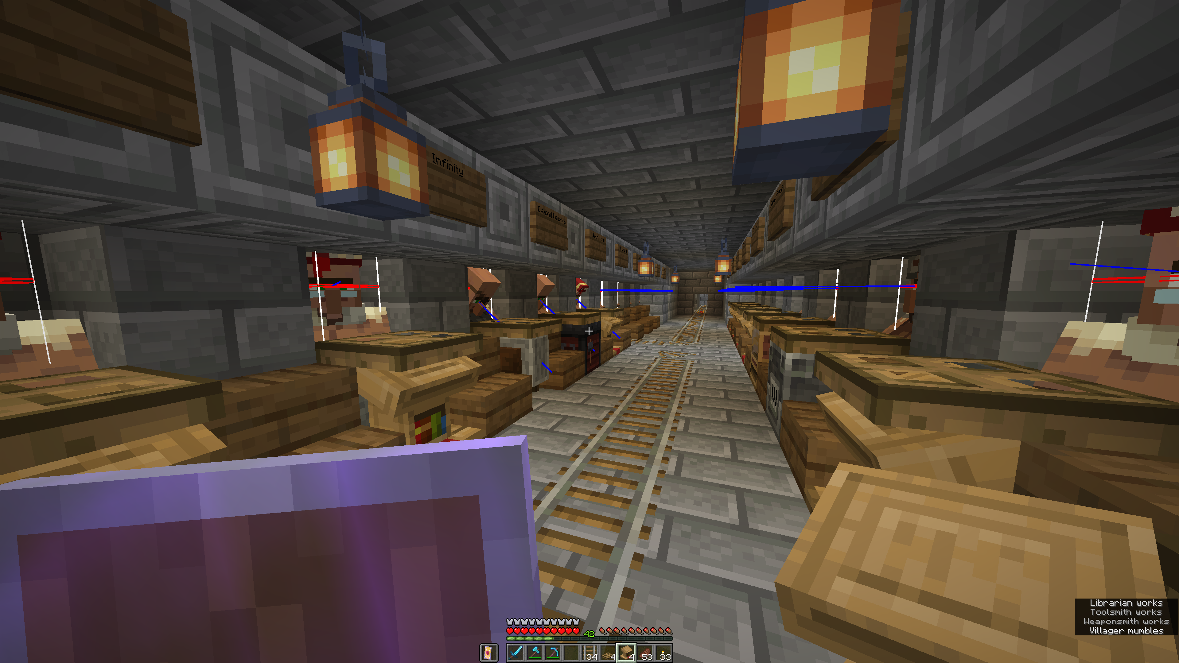 There are twenty villagers in an underground trading hall (no sky access). Each villager is inside of a minecart and each villager is next to an appropriate job site block (see screenshot "Trading Hall").