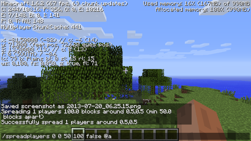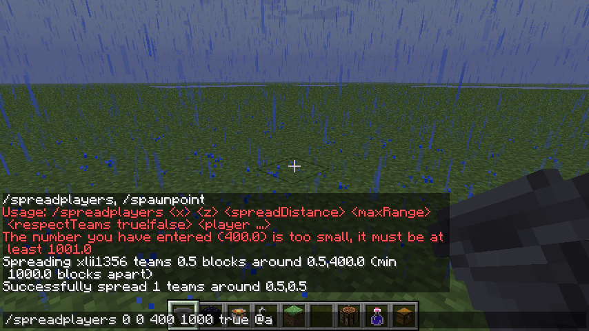 example: I typed /spreadplayers 0 0 400 1000 true @a