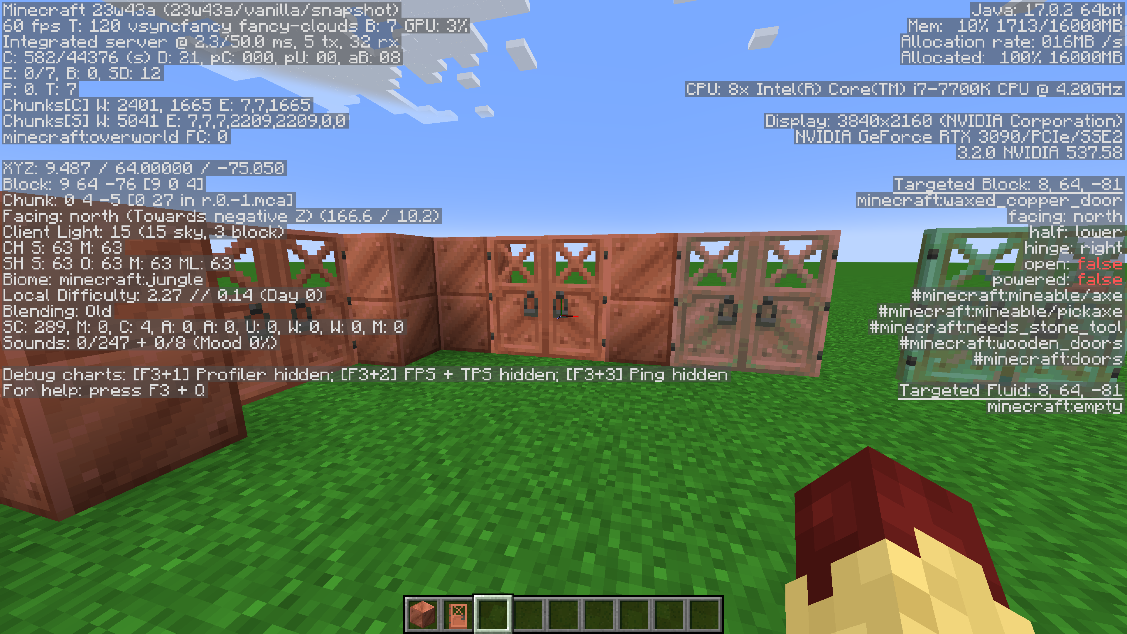 Front texture of the Copper Doors with hinge: right blockstate and back texture of Copper Doors with hinge: left blockstate have inconsistent shading in their textures when compared to surrounding copper blocks. Issue is present with all Copper Door oxidation levels, pictured in attachments is only un-oxidized variant because the issue is most prevalent.