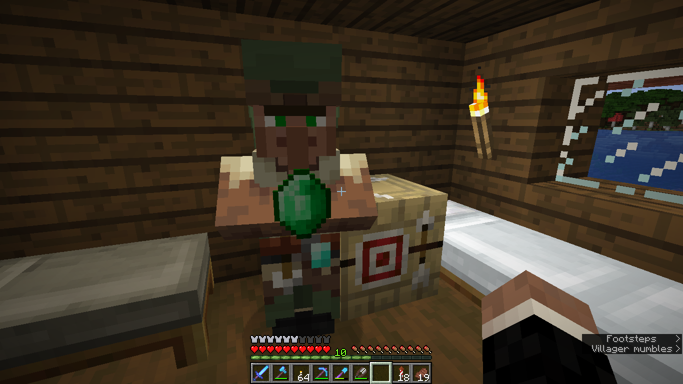 When an item (or a stack) is being held up by the player, the villager who will trade for that item holds the corresponding trade item up. If the player starts trading with the villager, and uses up all the items that were in the active hotbar slot, the villager will still be holding the trade item, despite the fact that the player now has an empty hand. This persists until the player changes the hotbar slot.