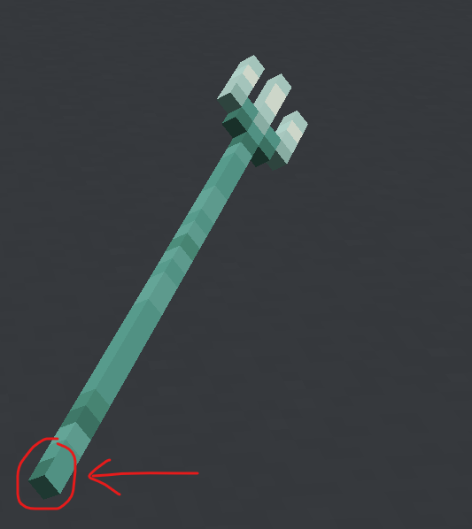 On the texture map of the trident, there is a strange inconsistency with the texturing of the handle of the trident. While almost all sides of the handle share the same texture across the north, south, east, and west faces, the bottom 'row' of pixels breaks this consistency established and uses 3 different colors for each face.