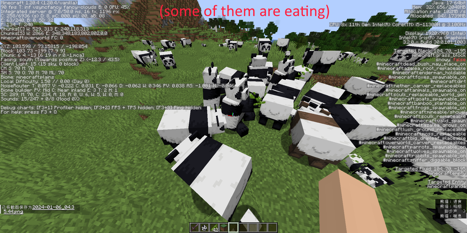原话 " 在Minecraft1.20.4中,熊猫的模型有错误,致使他们的脊背看起来是水平的。但是,当至少喂食一次之后,他们的模型会全部地自动修正,看起来是倾斜的。而且只要未重启游戏,熊猫的模型都不会再变回原先错误的模样,无论你是换存档玩还是换服务器玩。 (或许也可能是我正好理解反了,这也许是个喂食后模型集体出错的bug)"