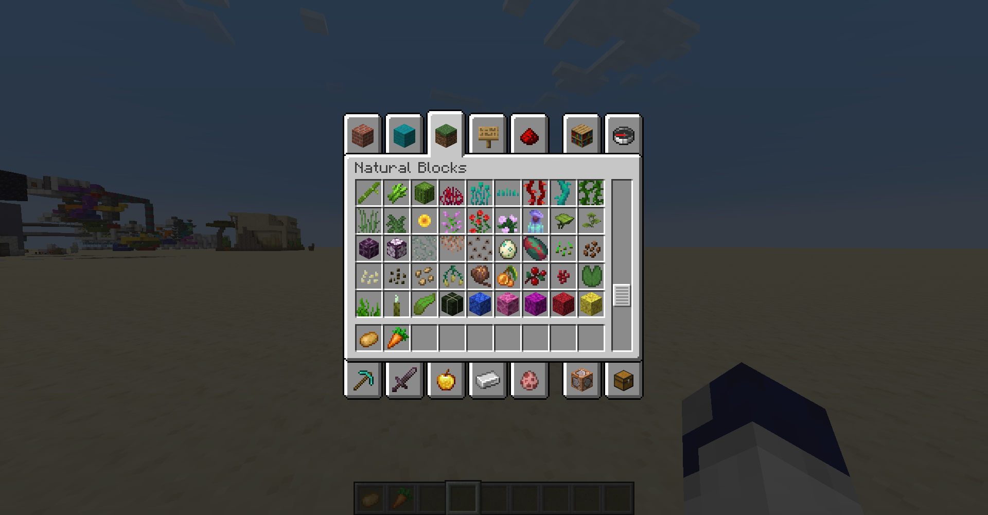 The potato and carrot items do not appear in the "Natural Blocks" tab in the creative inventory, which seems inconsistent with the other crop items, such as seeds, berries, and netherwart, which do appear in that tab.