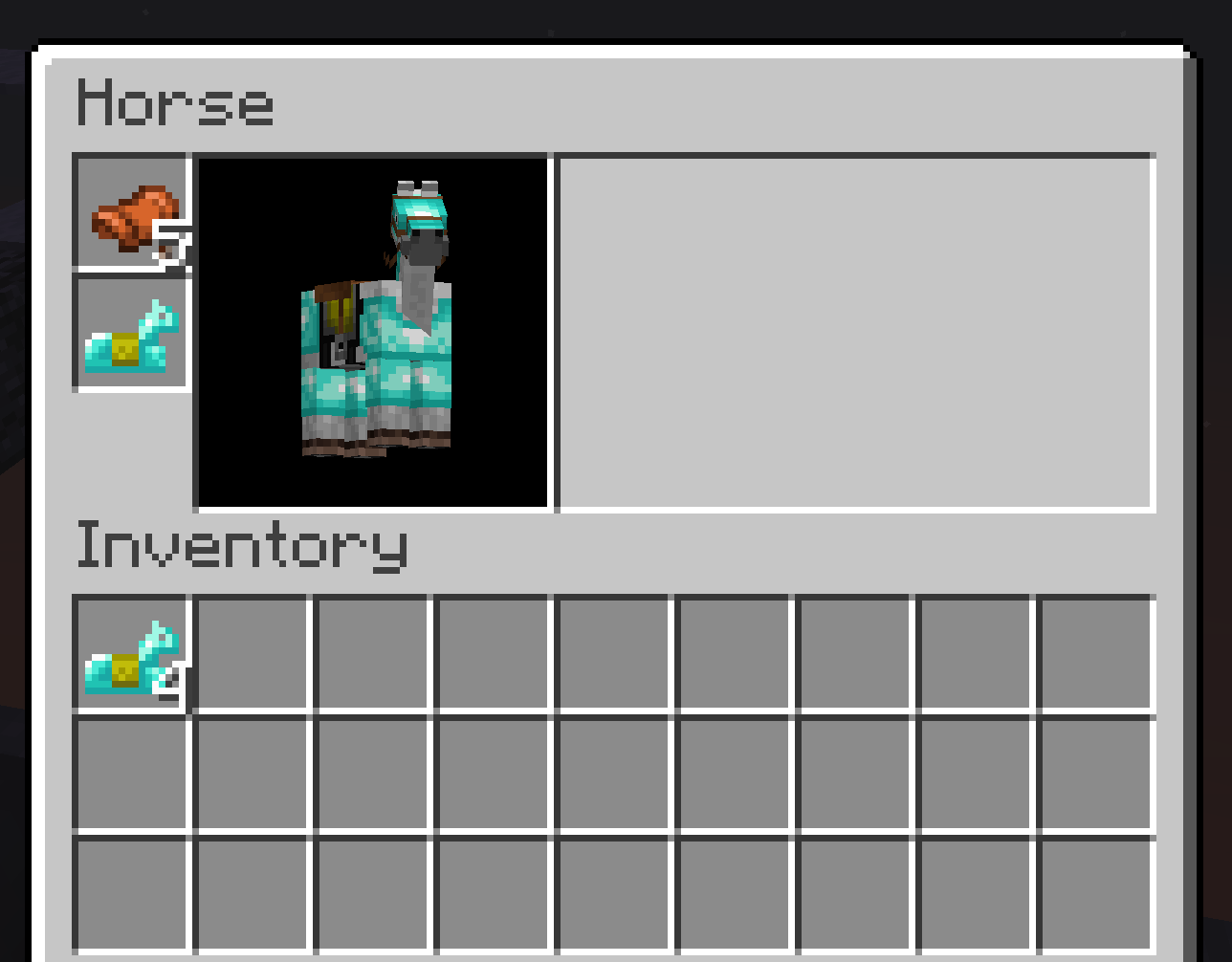 Horse armor with a stack size greater than 1 (possible through the max_stack_size item component) cannot be placed in full onto a horse using the horse's inventory screen; only a single item in the stack can be placed. However, with a similar saddle with a stack size greater than 1, the whole stack will be placed. This is an inconsistency and does not seem like correct behavior.