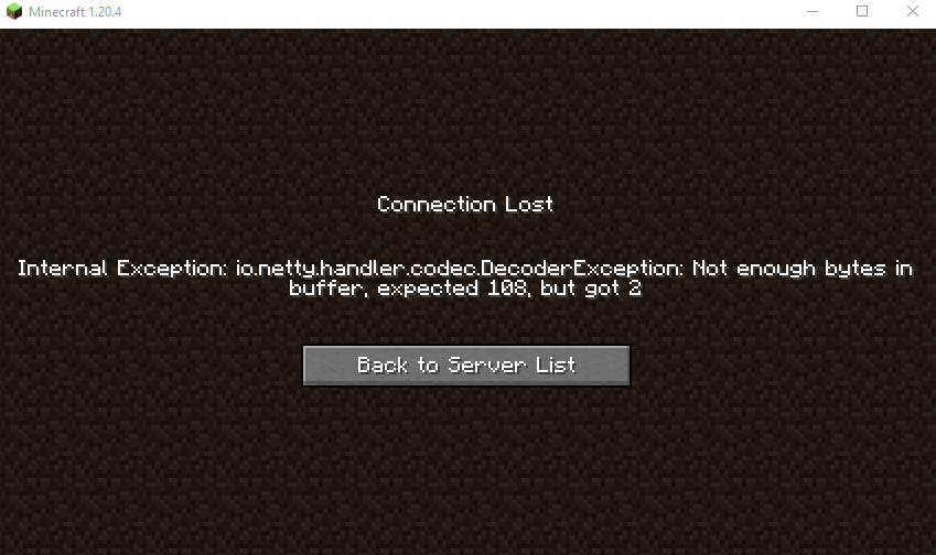 Hi! So I found another bug yet again, and it turns out this bug is in the latest version of java 1.20.4. Basically, every time I try and join this specific server it gives me this weird error screen, now when I try any other client and join the same server it works! So if ya can please fix this! Thanks!