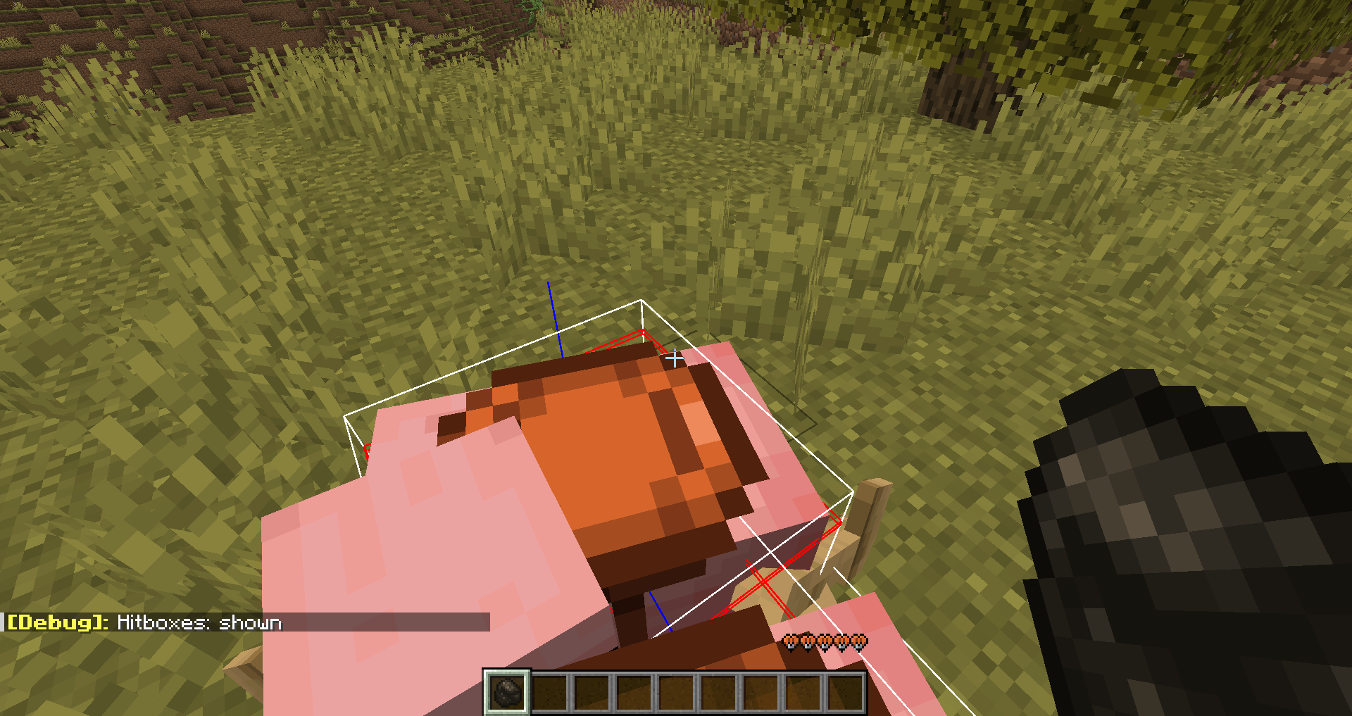Observation: You cannot target the other pig, preventing you from mounting it by right-clicking. Instead, your aim passes through the pig, allowing you to target blocks or entities beyond it.