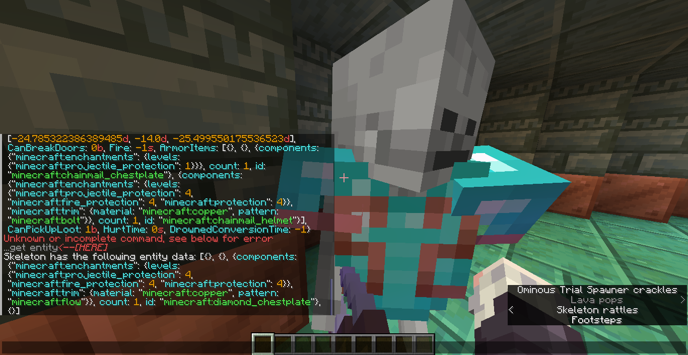 /data get entity <mob's uuid> ArmorItems/data get entity <mob's uuid> ArmorItemsNotice how the helmet you have (or the mob has) equipped has all protection enchantments.