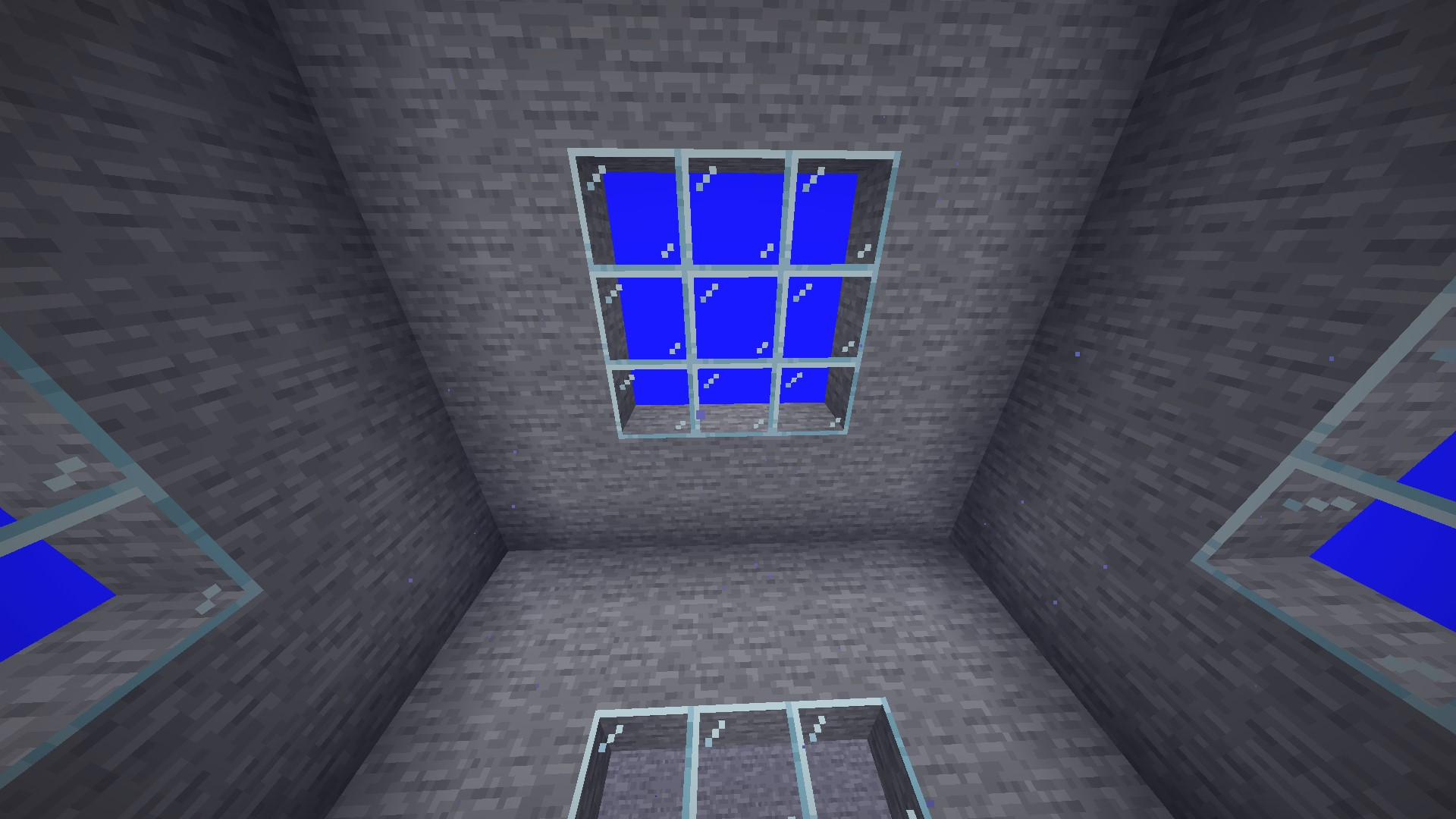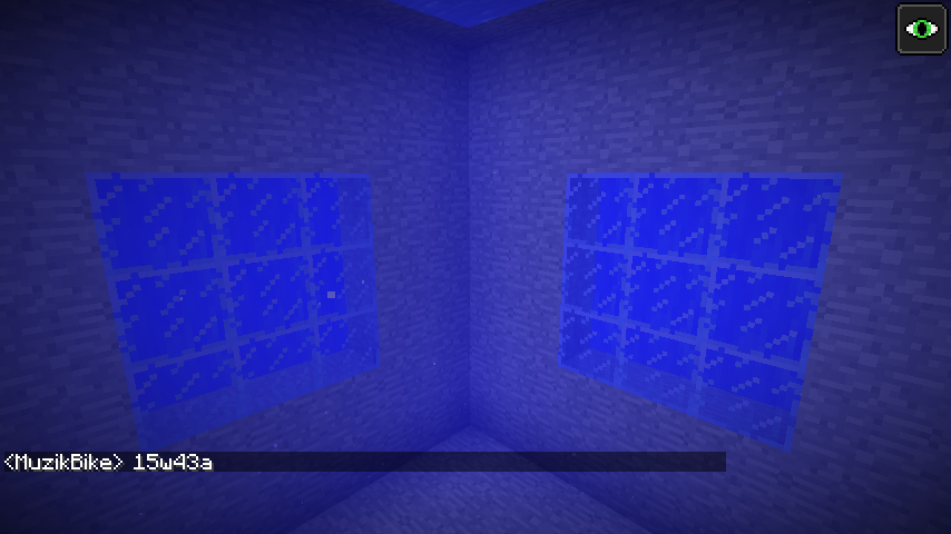 Snapshot 15w43b for 1.9 fixed MC-35790, an issue that made water hard to see through against glass due to it displaying the flowing texture. The fix made it display a flat, solid-colour texture instead. However, this also changed how glass looks from inside of the water - no texture is rendered against the glass at all. It'd be expected that the same flat water texture would be visible from inside the water, but this is not the case.