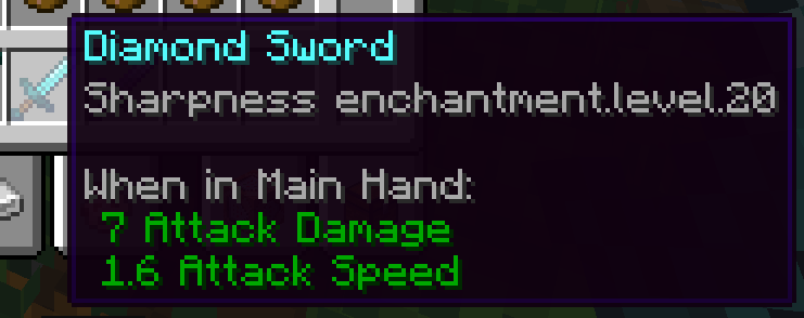 /give @p minecraft:diamond_sword[enchantments={levels:{"minecraft:sharpness":20}}] 1/give @p minecraft:diamond_sword[enchantments={levels:{"minecraft:sharpness":20}}] 1The sword still does damage correctly but the "attack damage" text used to show how much damage a sword would do with custom enchantments. Now only shows the default damage on that weapon when enchanted with sharpness higher than the default max.