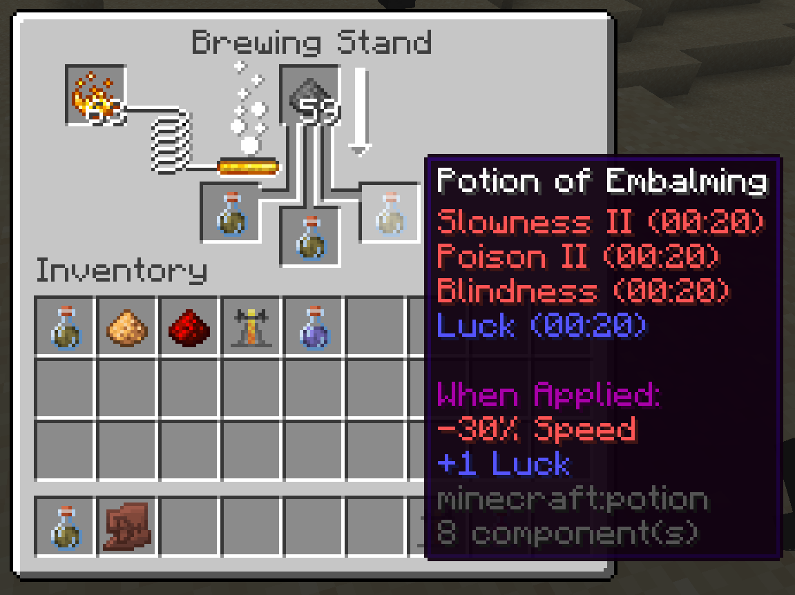 /loot give @s loot minecraft:archaeology/desert_pyramida couple of times until you get the Potion of Embalming. On 1.20.6, run/loot give @s loot minecraft:potion_of_embalming.Put it in a brewing stand alongside with gunpowder and blaze powder.