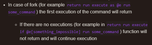 /return run execute as @e run say hi/return run execute as @e run say hiI expect that to completely evaluate everything to the right of the return before returning, as it would in a normal programming language, saying "hi" for each entity. Instead, it only says "hi" once, acting the same as the following command which does work as expected: