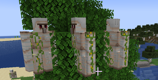 1. Utilizing the Iron Golem Spawn Egg, spawn an Iron Golem on a bunch of leaves (3x1 should work) or a tree (any type).