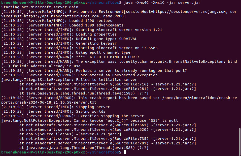 Here's what the terminal looks like when I try to boot the server.