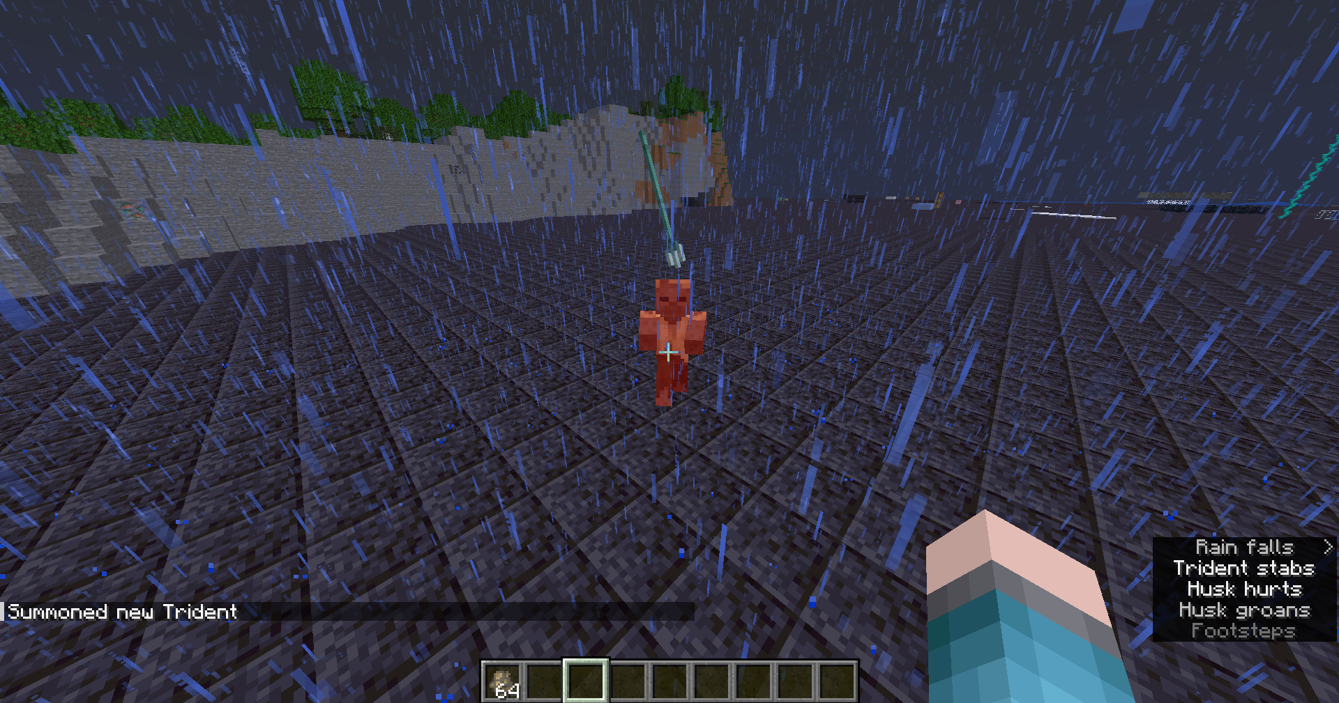 /weather thunder/weather thunderSummon a trident enchanted with channeling above the husk by using the command provided below.