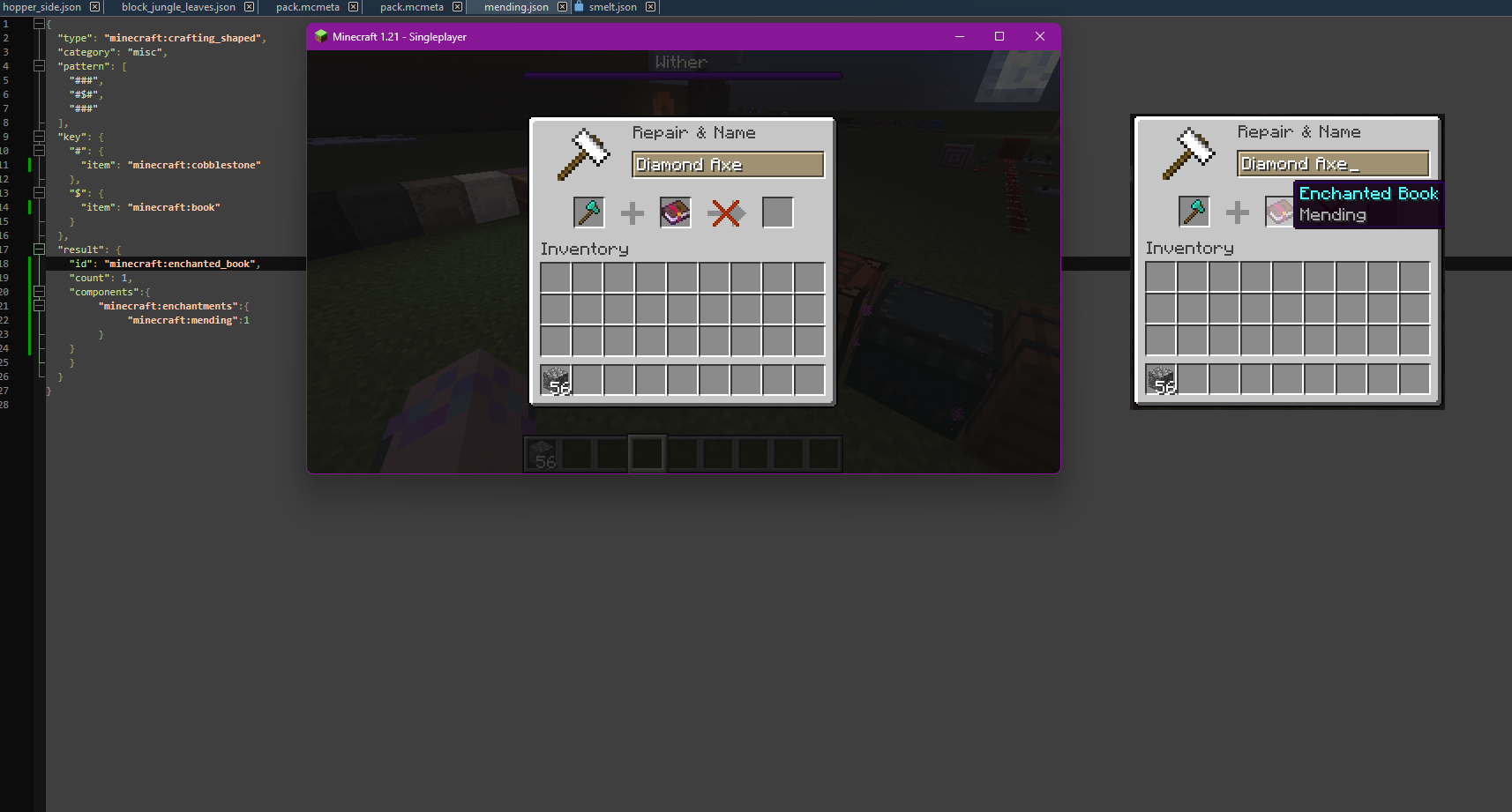Please find attached, a screenshot of my mending.json file which I used to create a book, and my attempt to use it in an anvil to add mending to an diamond axe, as well as me hovering over the enchanted book to demonstrate its' atypical name color.