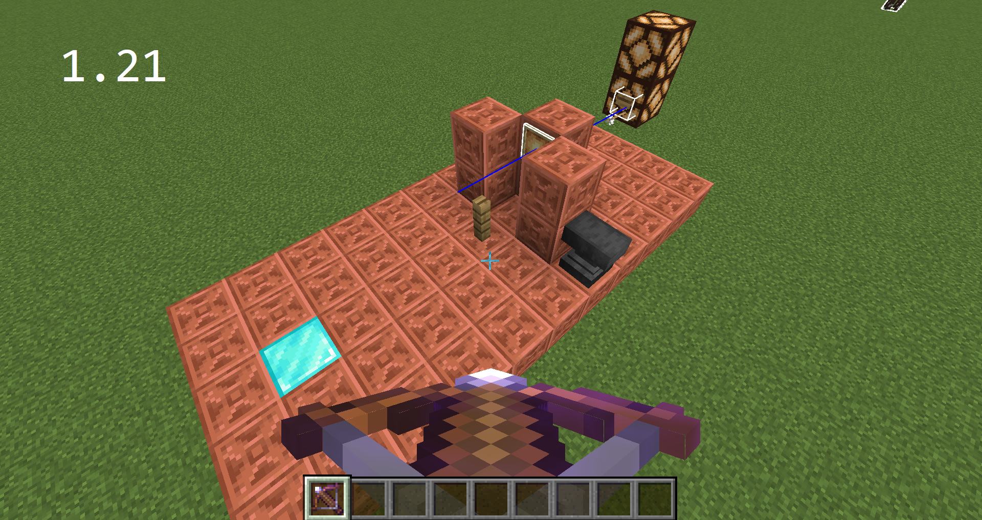 The First picture shows how i test this bug.Player stands on the diamond block and then shoot with the enchanted crossbow.The second to fifth picture respectively shows that the arrow piereces through the solid block and hit the button to light the redstone lamp.I also tested with the creeper, it also works.